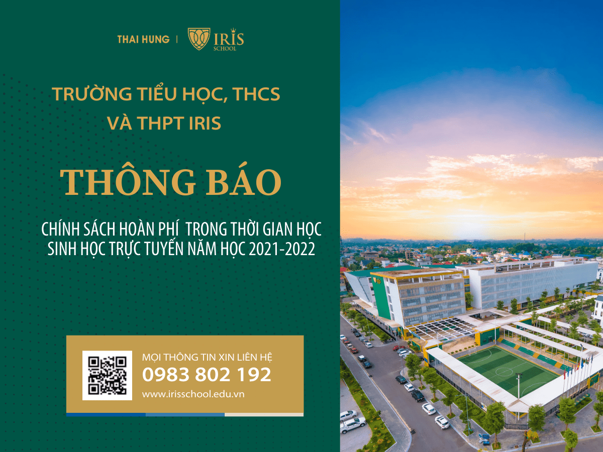 Trường Tiểu học, THCS và THPT Iris gửi tới Quý phụ huynh và các em học sinh thông báo về chính sách hoàn phí trong thời gian học sinh học trực tuyến năm học 2021-2022 do ảnh hưởng của dịch bệnh Covid-19.