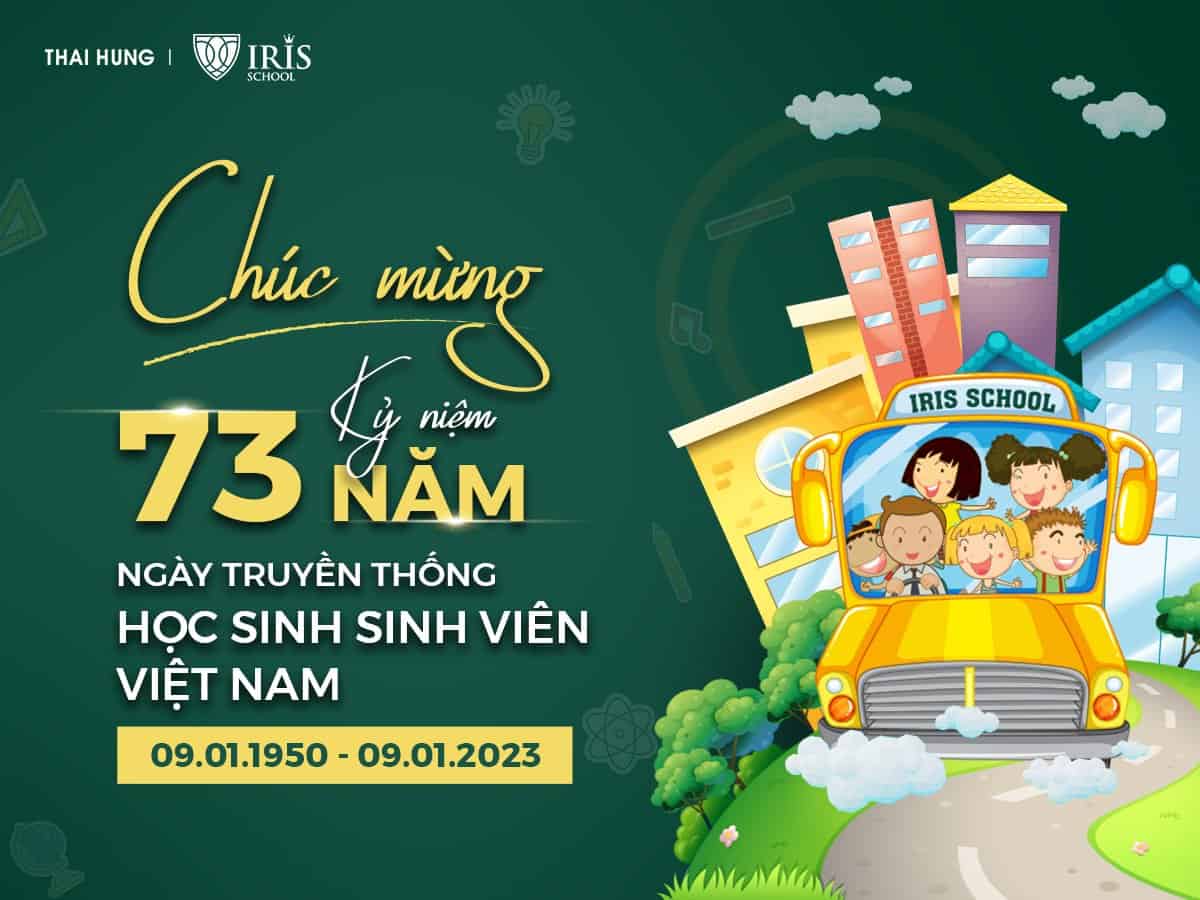 Nhân dịp kỷ niệm 73 năm Ngày truyền thống học sinh, sinh viên (09/01/1950 – 09/01/2023), Trường Iris xin được gửi những lời chúc tốt đẹp nhất tới các thế hệ học sinh, sinh viên nói chung và học sinh Trường Iris nói riêng. Chúc tất cả các bạn luôn mạnh khoẻ, sáng tạo, không ngừng học tập, rèn luyện để trở thành những công dân có ích cho xã hội, góp phần xây dựng quê hương, đất nước ngày càng giàu đẹp, văn minh, nghĩa tình.