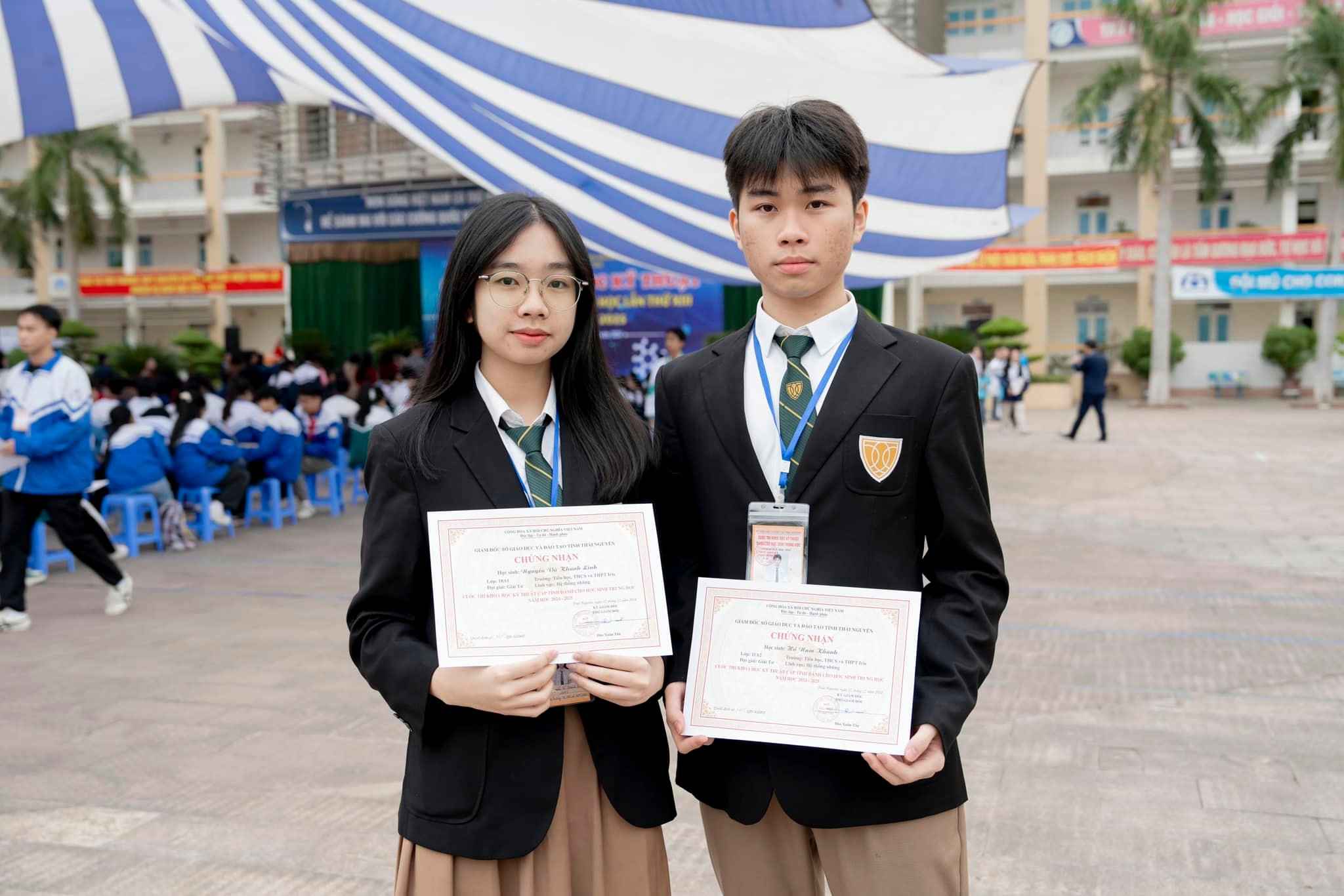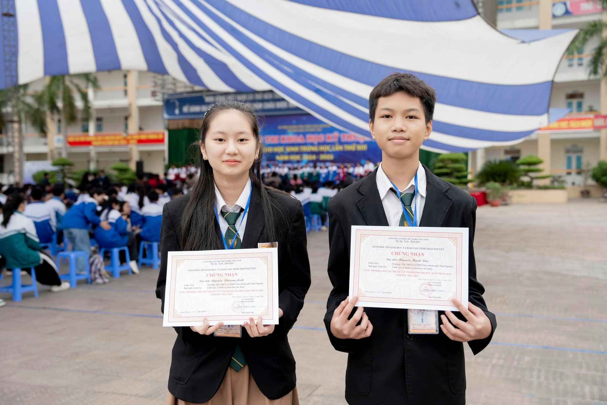 Dự án “Nghiên cứu sản xuất dung dịch đạm trứng hữu cơ từ trứng ấp hỏng thải từ lò ấp gà bằng quá trình lên men vi sinh và định hướng ứng dụng sử dụng cho nông nghiệp hữu cơ” của hai bạn Văn Hữu Lương Nguyên (9A3) và Đoàn Gia Khiêm (9A2) xuất sắc giành giải Ba của cuộc thi. Dự án do cô Trần Thị Phương và cô Nguyễn Phương Chi bảo trợ; PGS.TS Văn Hữu Tập (Trung tâm phát triển Công nghệ mới – Đại học Thái Nguyên) hướng dẫn khoa học.