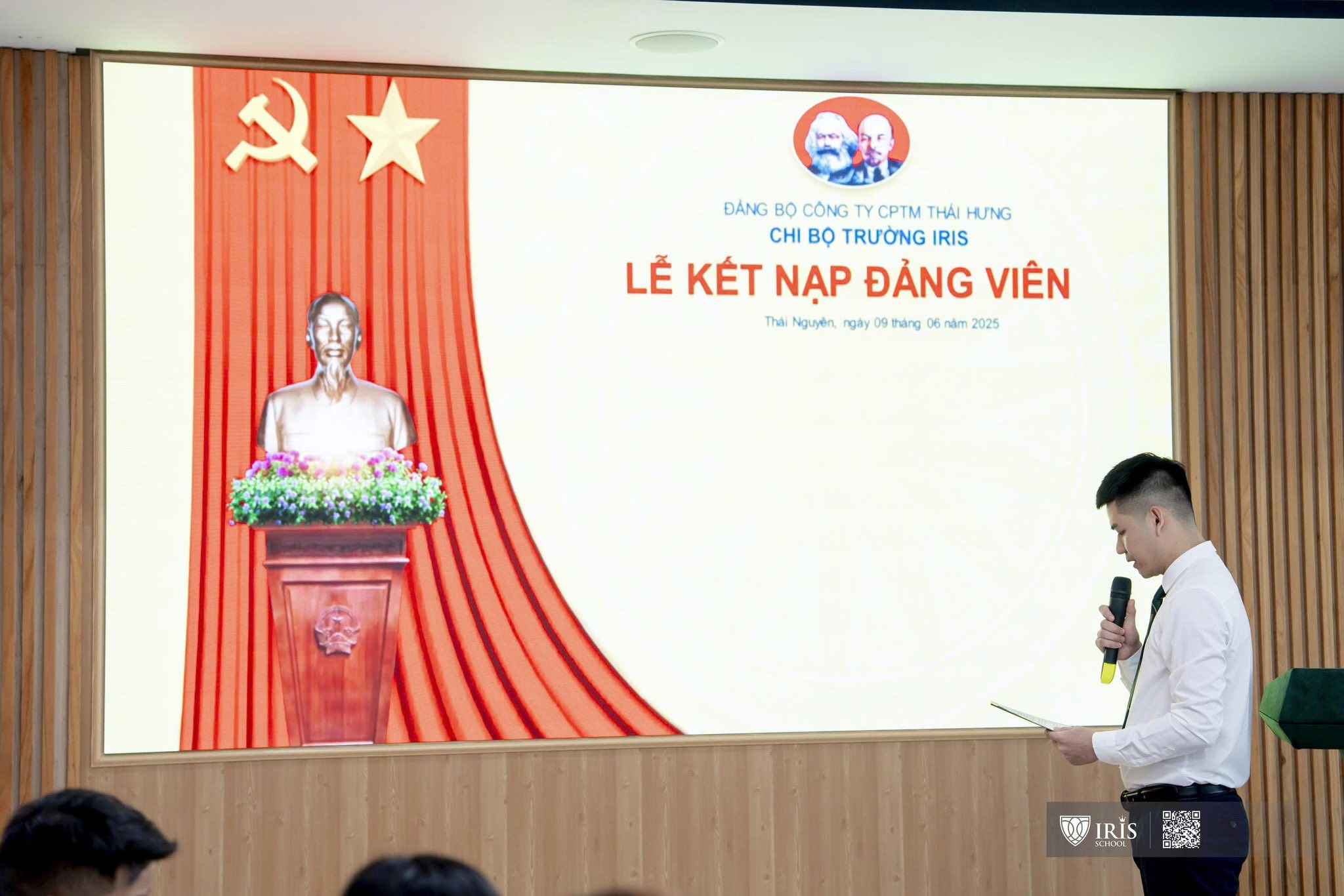 Tại buổi lễ, đồng chí Phạm Thị Thanh Bình – Bí thư Chi bộ Trường Iris đã trao Quyết định kết nạp Đảng cho đồng chí Phạm Khánh Duy. Dưới Cờ Tổ quốc, Cờ Đảng và chân dung Chủ tịch Hồ Chí Minh, đồng chí Khánh Duy đã đọc lời tuyên thệ, thể hiện quyết tâm tuyệt đối trung thành với lý tưởng của Đảng, tích cực học tập, rèn luyện, phấn đấu trở thành Đảng viên gương mẫu.
