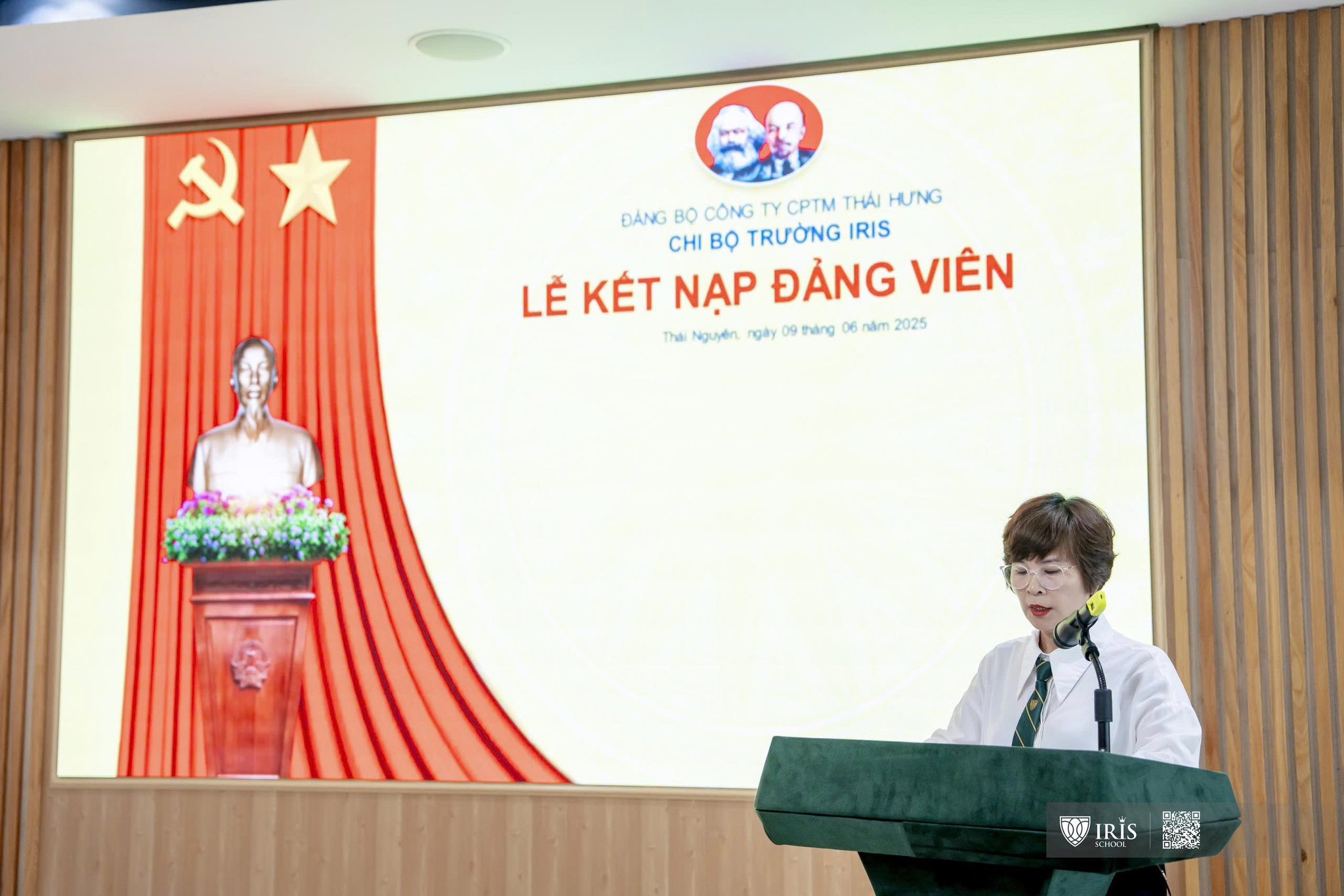Tại buổi lễ, đồng chí Phạm Thị Thanh Bình – Bí thư Chi bộ Trường Iris đã trao Quyết định kết nạp Đảng cho đồng chí Phạm Khánh Duy. Dưới Cờ Tổ quốc, Cờ Đảng và chân dung Chủ tịch Hồ Chí Minh, đồng chí Khánh Duy đã đọc lời tuyên thệ, thể hiện quyết tâm tuyệt đối trung thành với lý tưởng của Đảng, tích cực học tập, rèn luyện, phấn đấu trở thành Đảng viên gương mẫu.