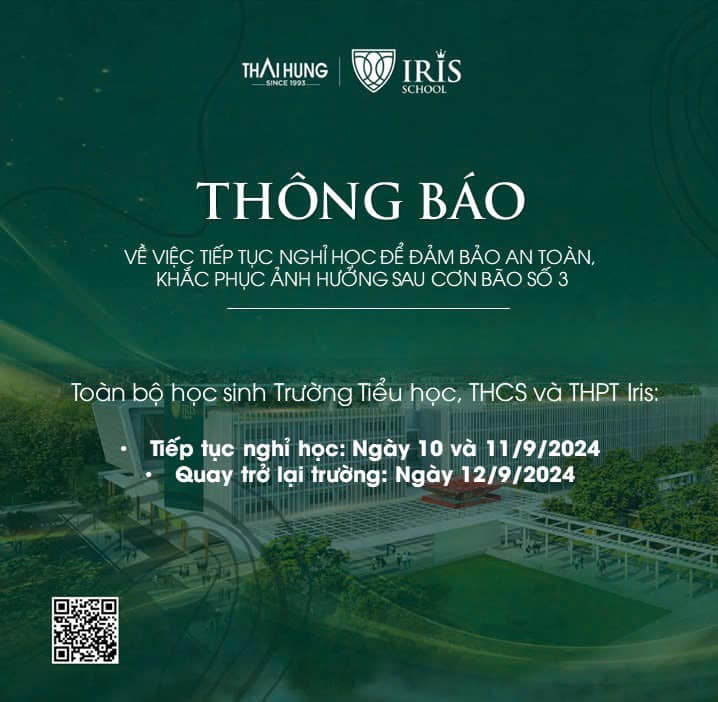 Kính gửi: Quý Phụ huynh và học sinh toàn trường! Nhà trường xin thông báo: Toàn bộ học sinh sẽ tiếp tục nghỉ học 02 ngày: 10 và 11/9/2024 để đảm bảo an toàn cho các con và gia đình trong quá trình khắc phục hậu quả sau bão. Học sinh sẽ quay trở lại […]