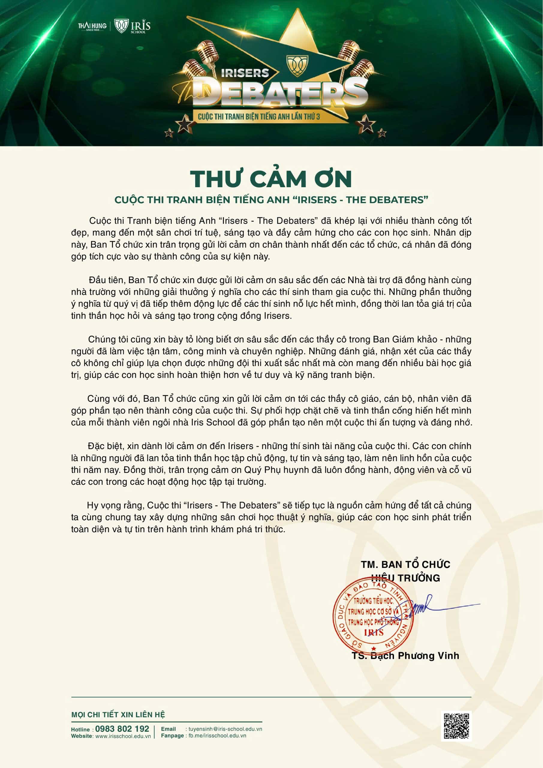 Cuộc thi Tranh biện tiếng Anh “Irisers – The Debaters” đã khép lại với nhiều thành công tốt đẹp, mang đến một sân chơi trí tuệ, sáng tạo và đầy cảm hứng cho các con học sinh. Nhân dịp này, Ban Tổ chức xin trân trọng gửi lời cảm ơn chân thành nhất đến các […]