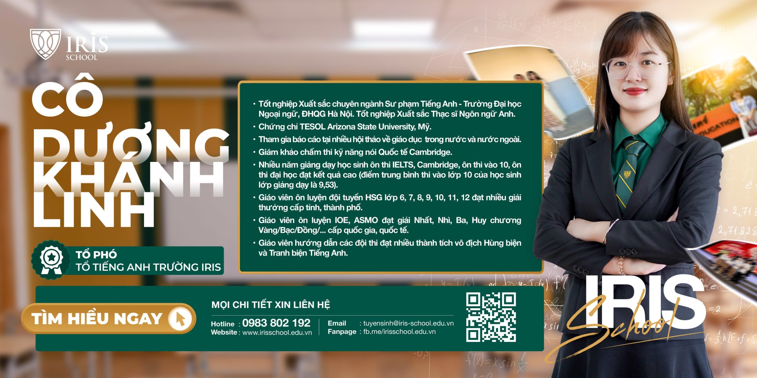 Teach the leaner, not just the language – Đó là triết lý giảng dạy mà cô Dương Khánh Linh, Tổ phó Tổ Tiếng Anh phụ trách cấp THCS và THPT luôn coi là kim chỉ nam trong hành trình đồng hành và phát triển cùng học sinh tại Trường Iris. Với cô, dạy tiếng Anh không chỉ là dạy ngôn ngữ, mà là đồng hành cùng học sinh khám phá bản thân, thể hiện tiếng nói riêng và xây dựng bản lĩnh trong một thế giới không ngừng biến động.