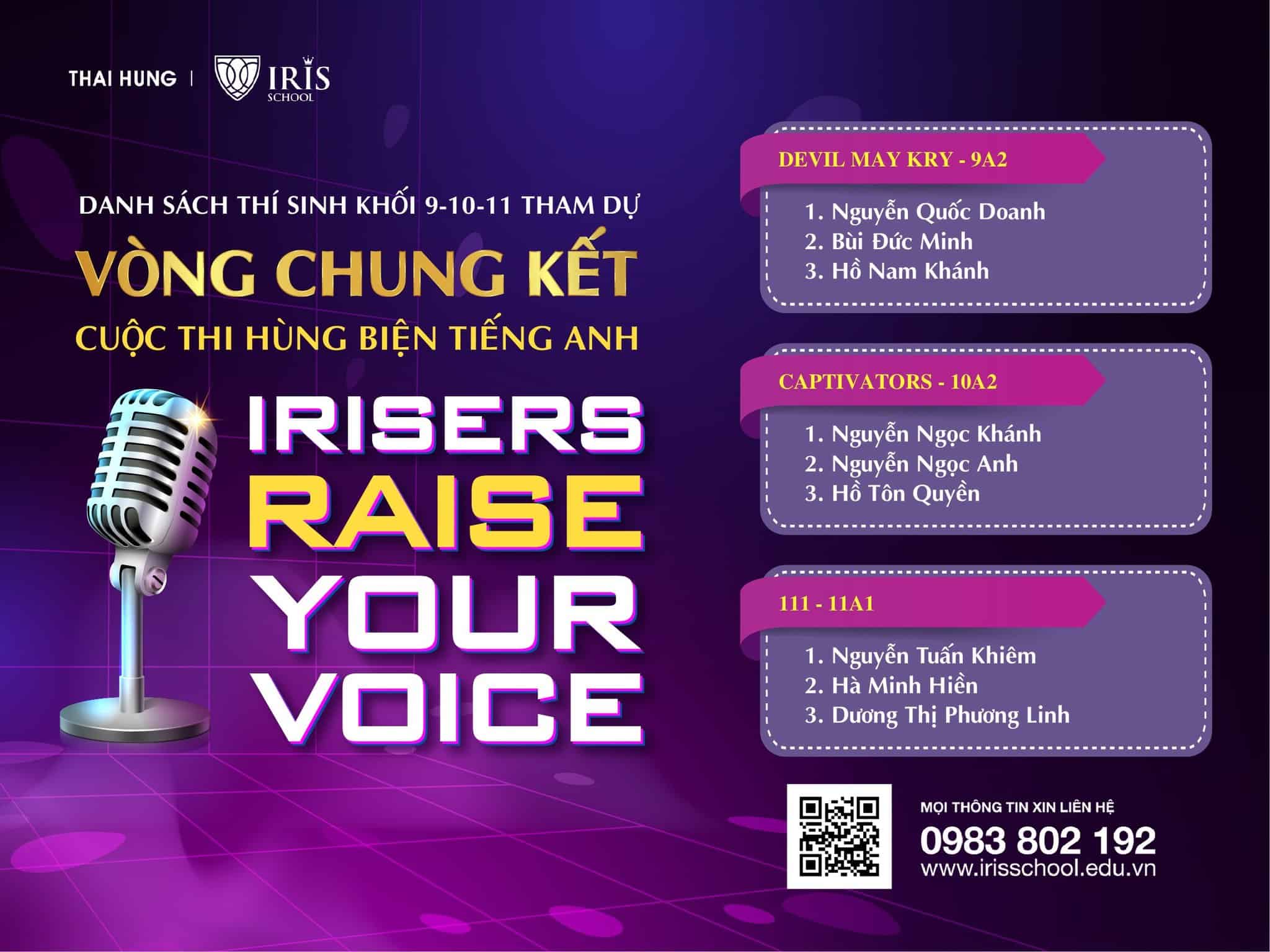 “Irisers – Raise Your Voice” là cuộc thi hùng biện tiếng Anh dành cho các em học sinh cấp THCS và THPT lần đầu tiên được tổ chức tại Iris School. Cuộc thi được tổ chức nhằm tạo sân chơi rèn luyện năng lực Tiếng Anh lành mạnh, bổ ích đồng thời tăng cường kỹ năng nói và kỹ năng hùng biện Tiếng Anh cho học sinh.