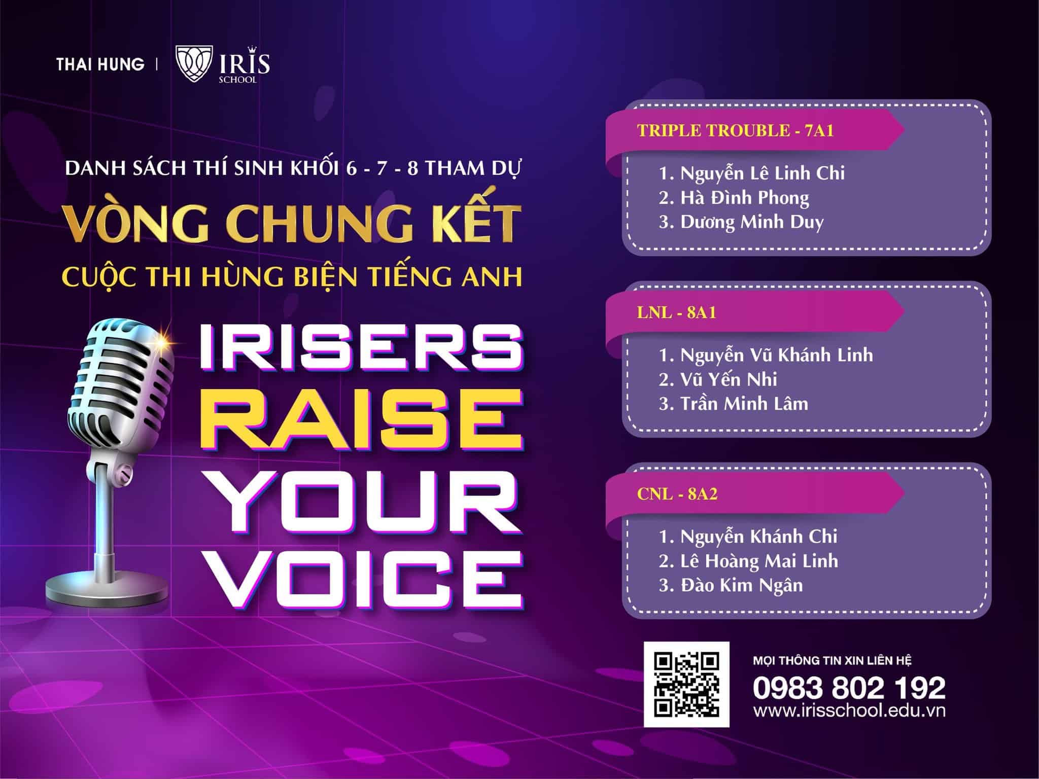 “Irisers – Raise Your Voice” là cuộc thi hùng biện tiếng Anh dành cho các em học sinh cấp THCS và THPT lần đầu tiên được tổ chức tại Iris School. Cuộc thi được tổ chức nhằm tạo sân chơi rèn luyện năng lực Tiếng Anh lành mạnh, bổ ích đồng thời tăng cường kỹ năng nói và kỹ năng hùng biện Tiếng Anh cho học sinh.
