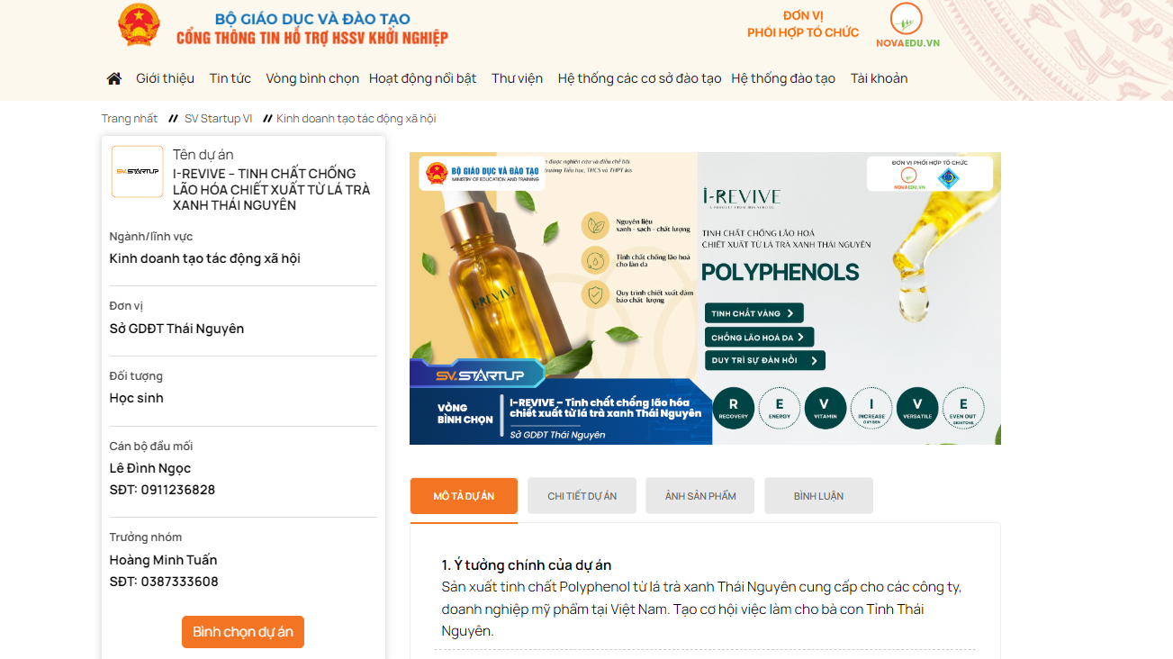 ✔️ Bước 3: Tìm tên dự án “I-REVIVE Tinh chất chống lão hóa chiết xuất từ lá trà xanh Thái Nguyên” thuộc lĩnh vực tạo tác động xã hội của học sinh.