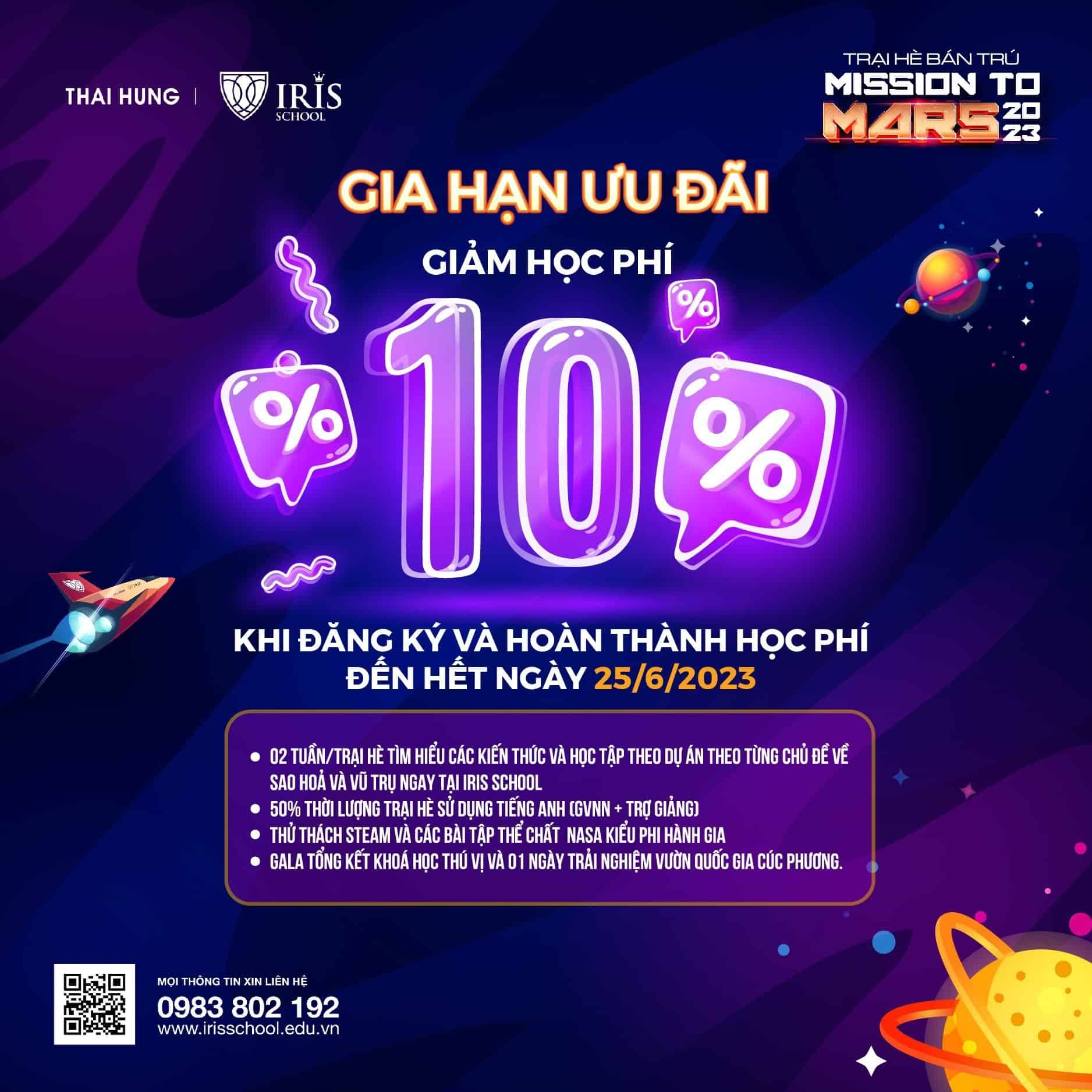Với mong muốn tạo điều kiện cho nhiều hơn nữa các em học sinh trên địa bàn tỉnh tham gia Trại hè Mission to Mars, nhà trường quyết định gia hạn thời gian ƯU ĐÃI 10% khi đăng ký và hoàn thành học phí đến hết ngày 25/6/2023.
