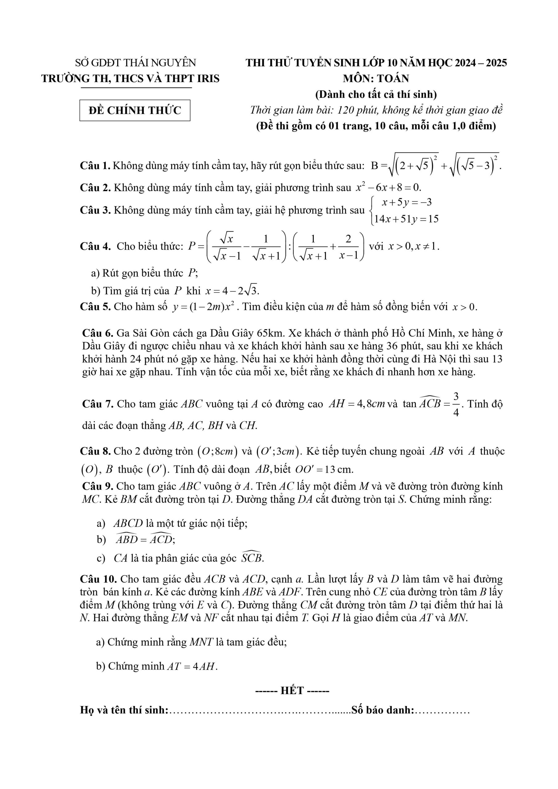 Đề thi, đáp án thi thử vào lớp 10 Trường Iris đợt 1 năm học 2024 – 2025