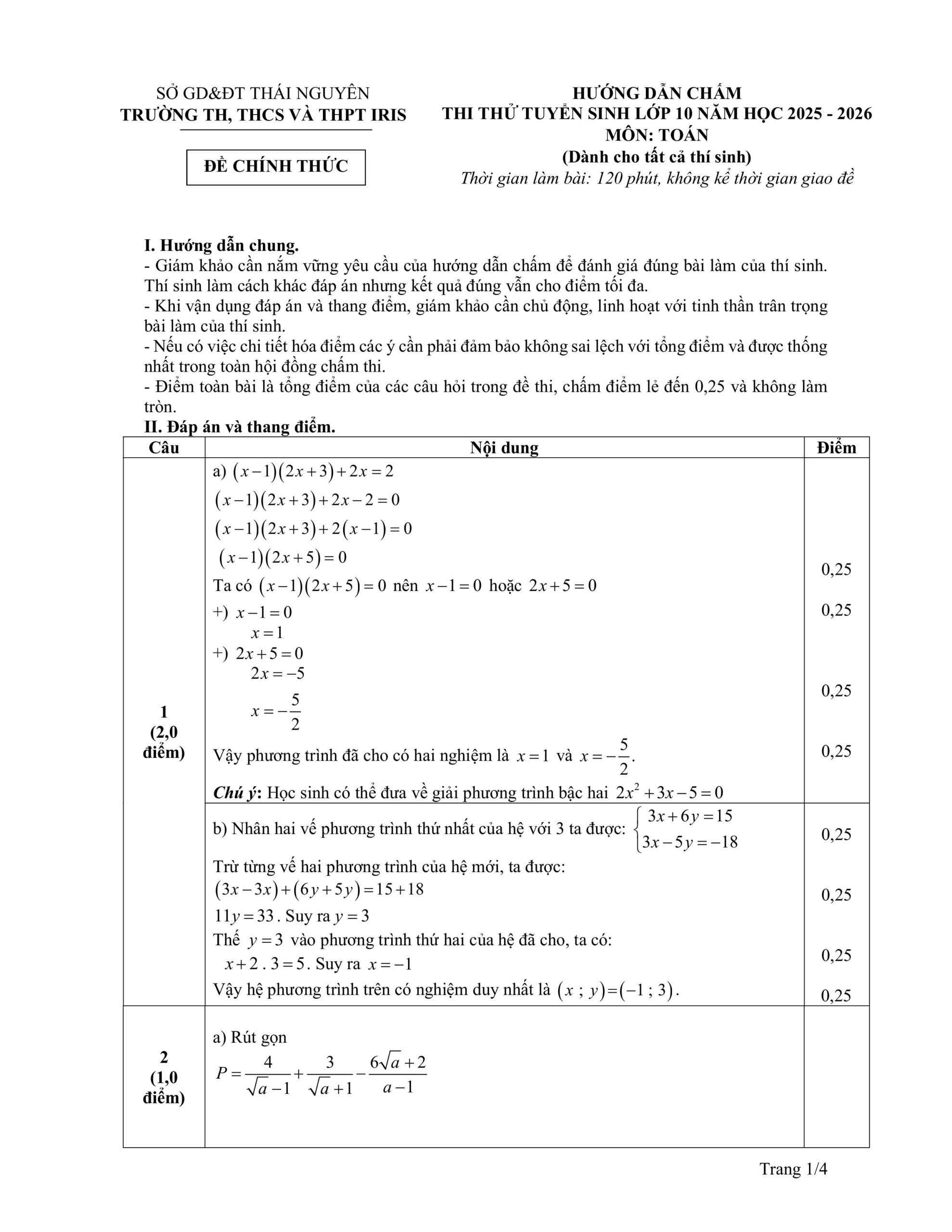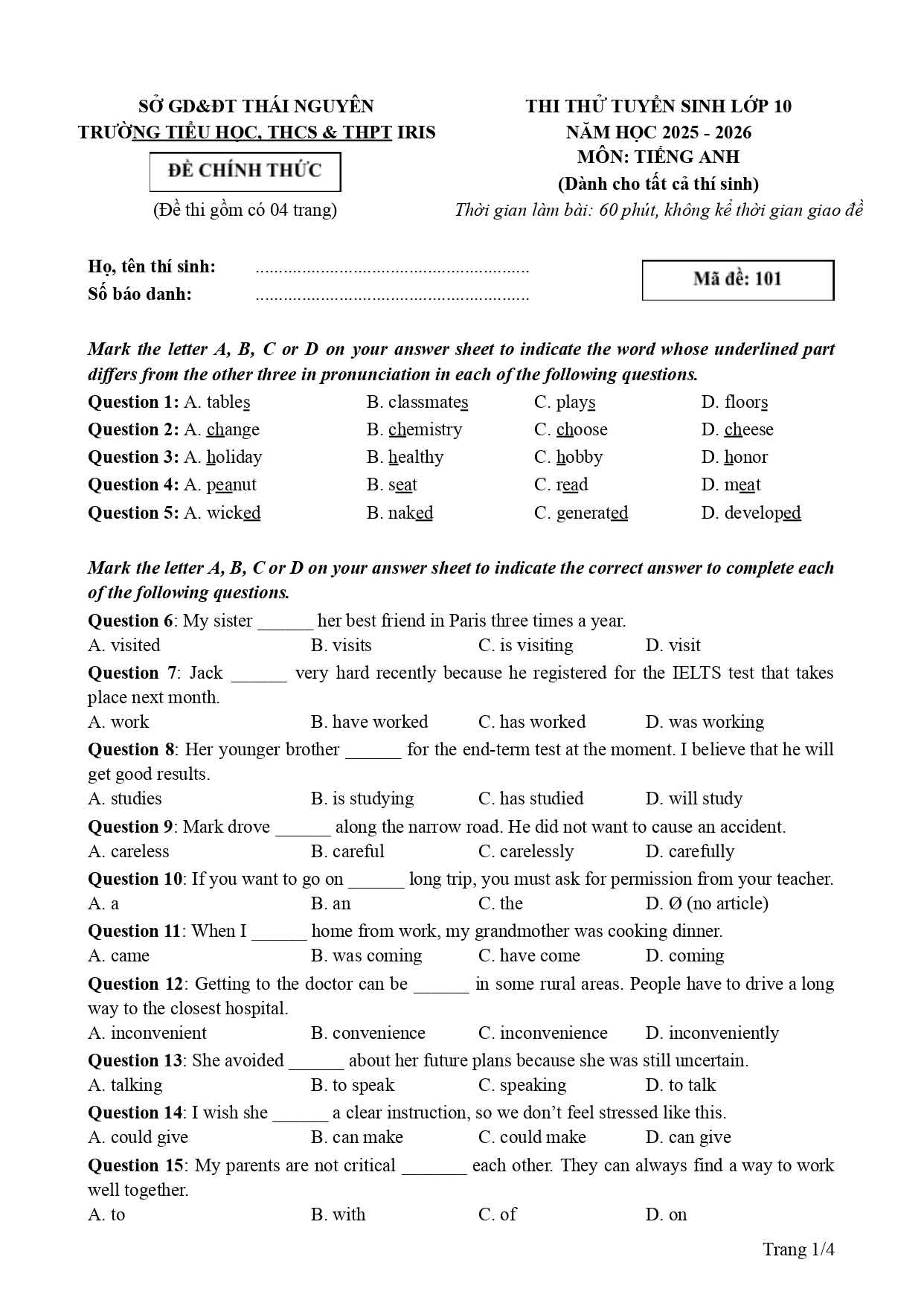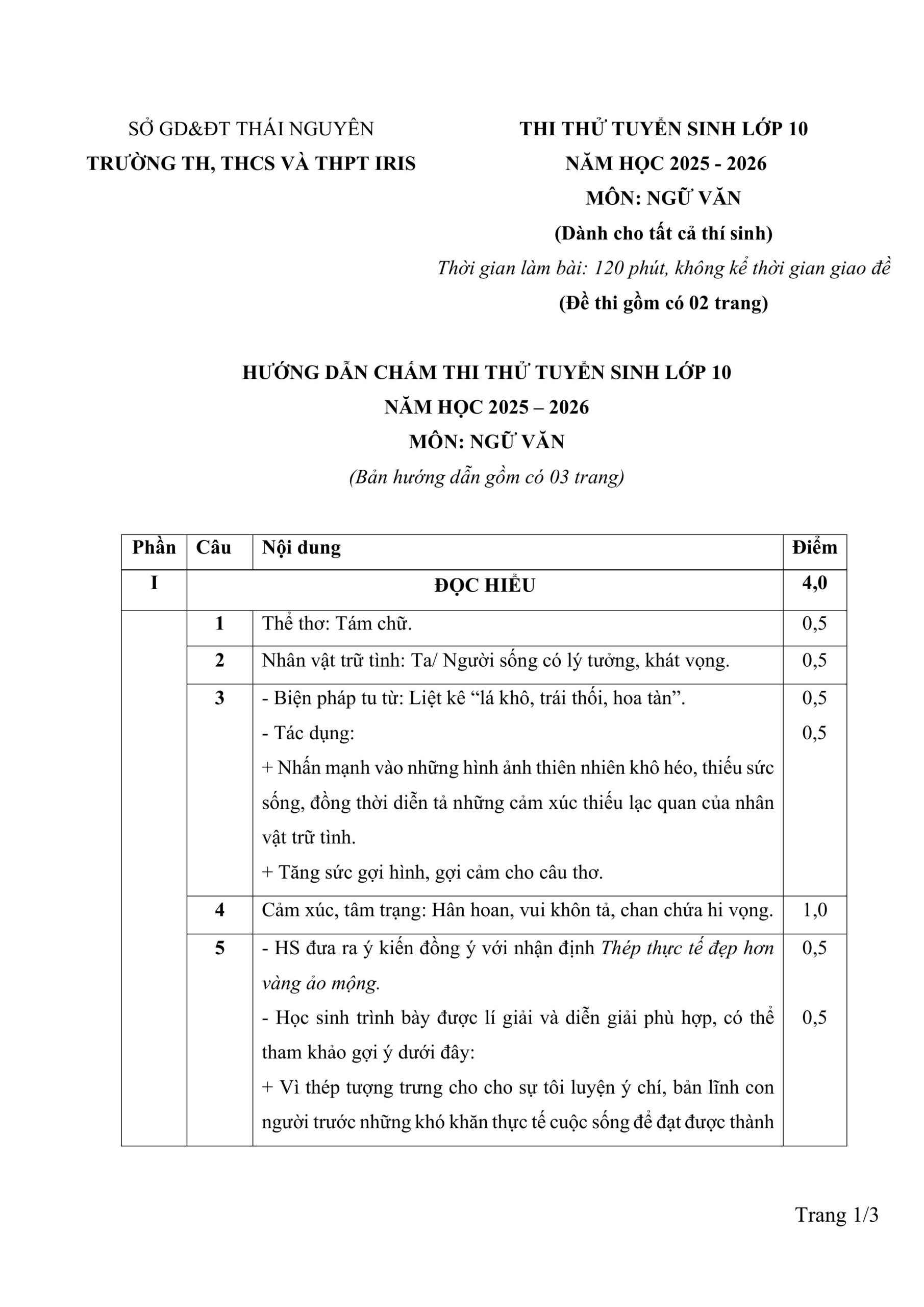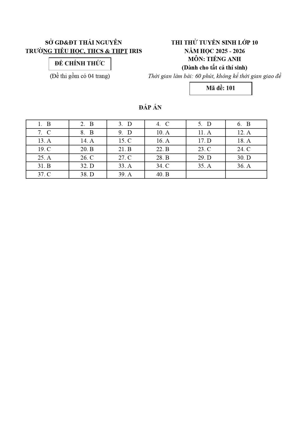 Ngày 23/02/2025, Trường Iris đã tổ chức thi thử đợt 1 tuyển sinh vào lớp 10 năm học 2025 – 2026 để học sinh thử sức, làm quen với định dạng đề thi, có sự chuẩn bị tốt hơn trước khi kỳ thi chính thức diễn ra. Dưới đây là đề thi và đáp án thi thử vào lớp 10 Trường Iris để học sinh, phụ huynh tham khảo.