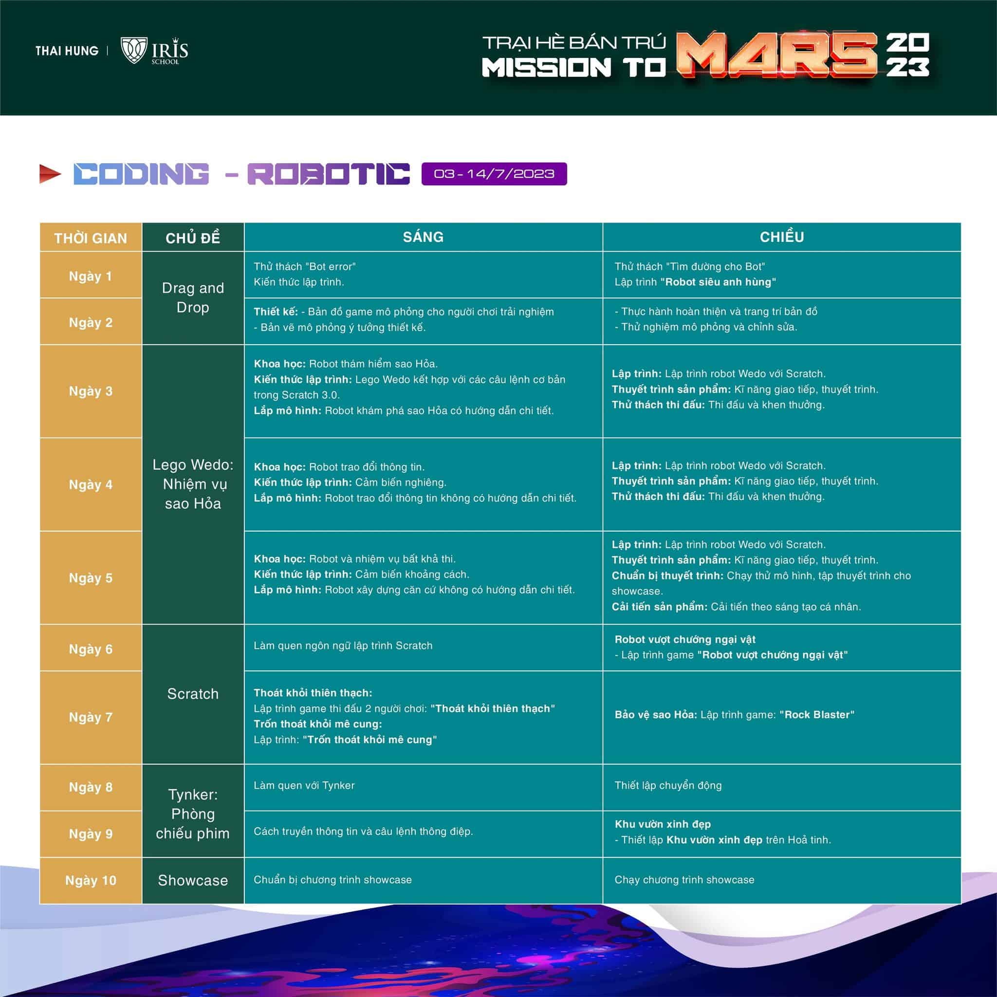 Các “nhà du hành nhí” sẽ được mở mang kiến thức về Toán, Khoa học và các kiến thức xã hội như đặc điểm địa hình, phương thức truyền tin, phát minh xe tự hành khám phá sao Hỏa… Tiếp cận với nền tảng lập trình kéo thả trên nền công nghệ lập trình toàn cầu, thiết kế bản đồ game mô phỏng cho người chơi; xây dựng kịch bản và lập trình robot vượt chướng ngại vật; ứng dụng công nghệ vào mô phỏng một phòng chiếu phim hoạt hình; lắp ráp và lập trình những mô hình robot thông minh thay con người thực hiện các nhiệm vụ bí mật trên sao Hỏa.