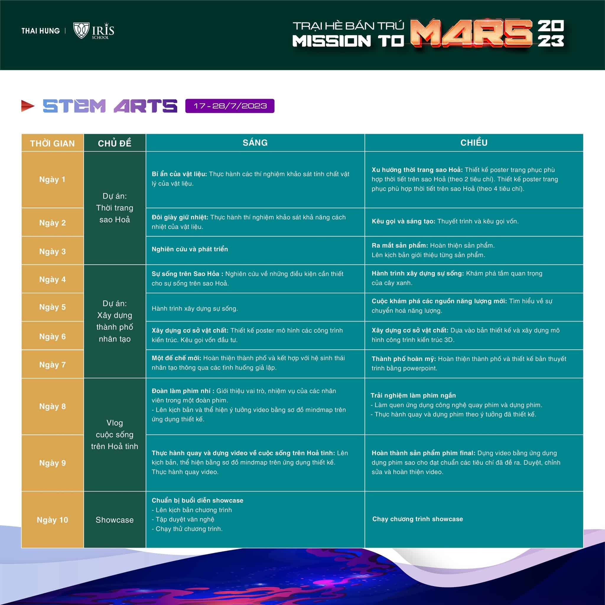 Học sinh sẽ được hóa thân thành các nhà thiết kế, kỹ sư để thiết kế, kêu gọi vốn đầu tư và chế tạo trang phục sao Hoả đáp ứng yêu cầu về thời tiết, các công trình kiến trúc, sáng tạo nội dung vlog về cuộc sống trên thành phố sao Hỏa văn minh.