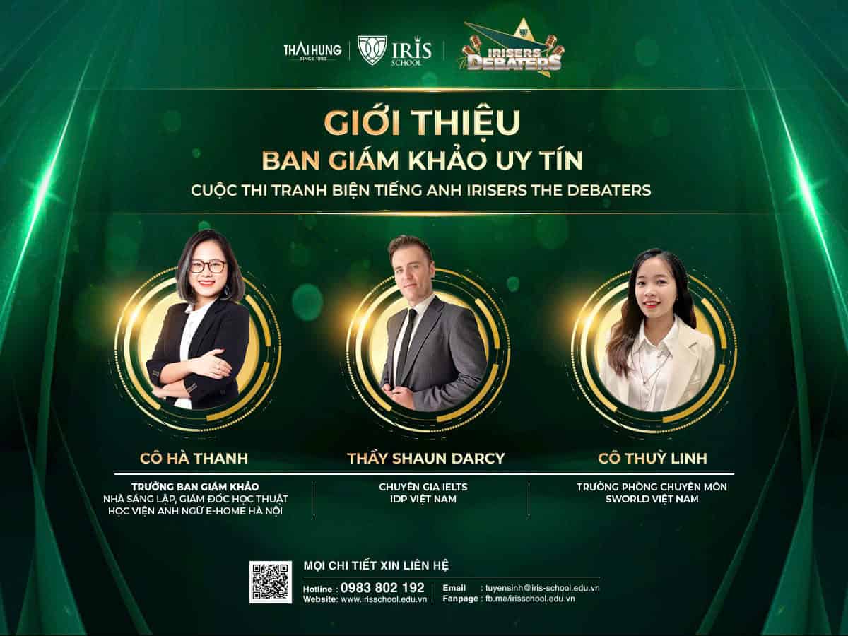 Irisers – The Debaters hứa hẹn sẽ là một hành trình bùng nổ ý tưởng, sáng tạo và đầy thử thách! Cùng với sự đồng hành của Đội ngũ Giám khảo có trình độ chuyên môn cao, dày dặn kinh nghiệm tham gia các cuộc thi tranh biện lớn, Cuộc thi tranh biện tiếng Anh “Irisers – The Debaters” chắc chắn sẽ tìm ra được Quán quân xuất sắc nhất!