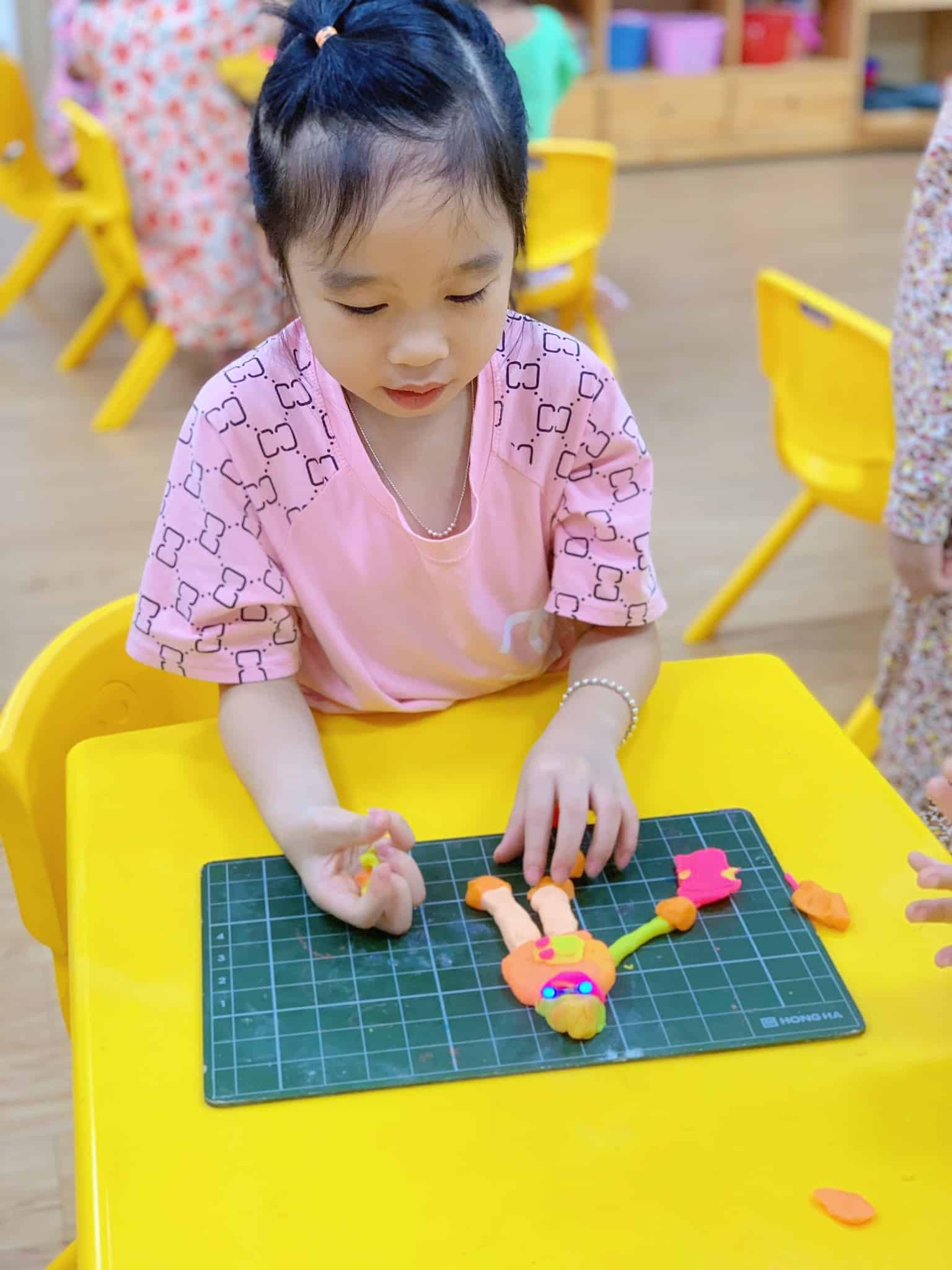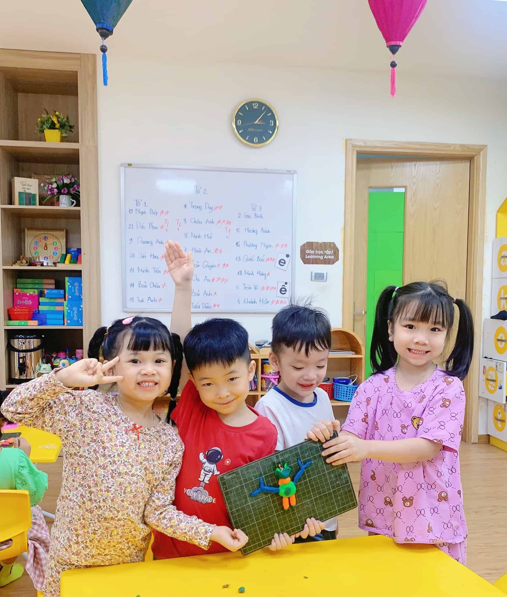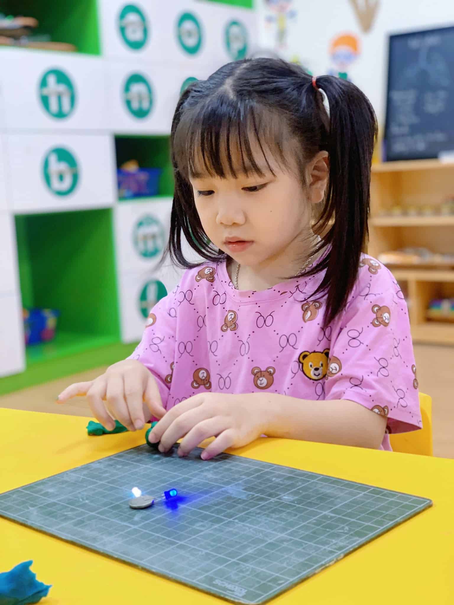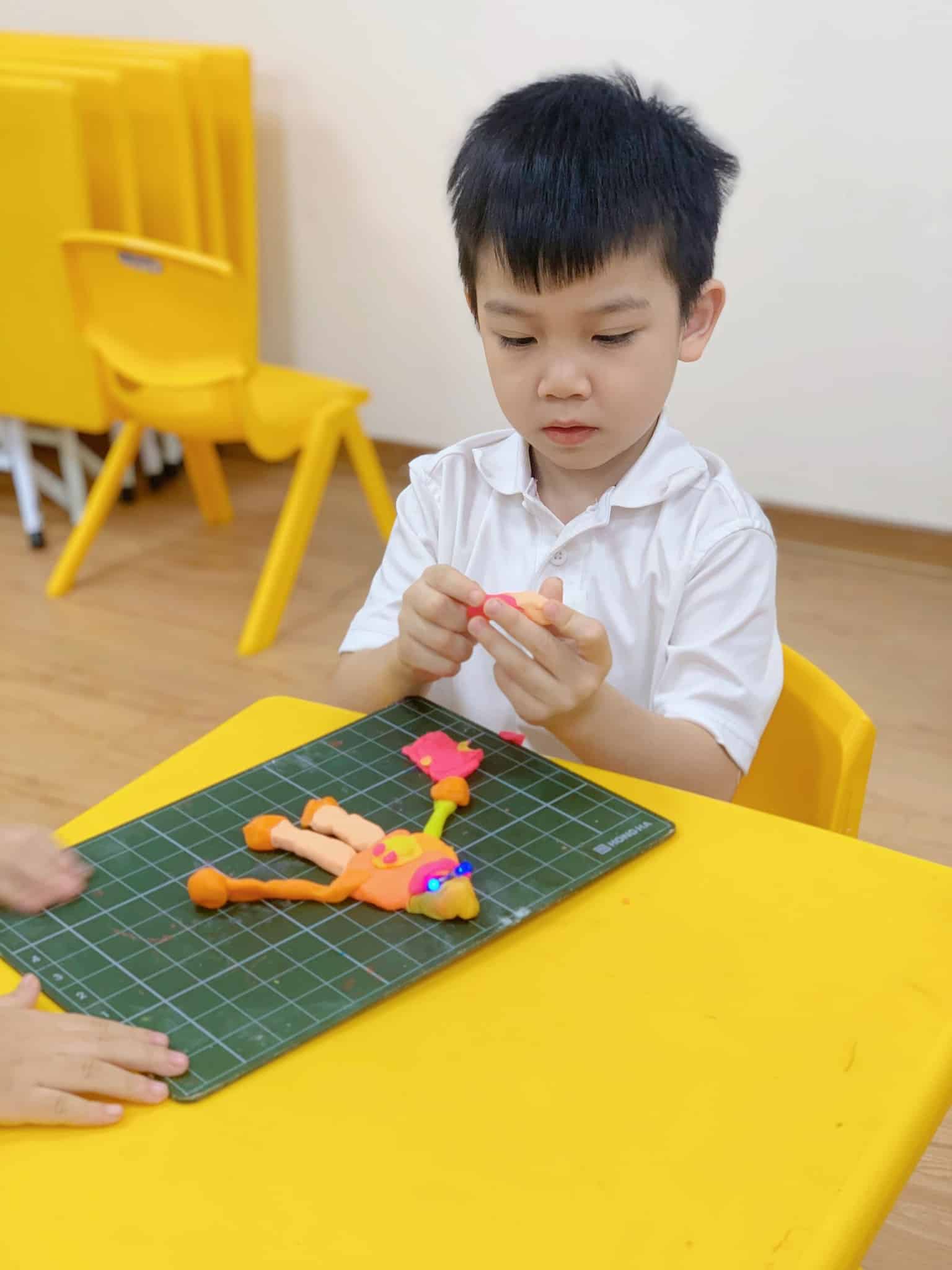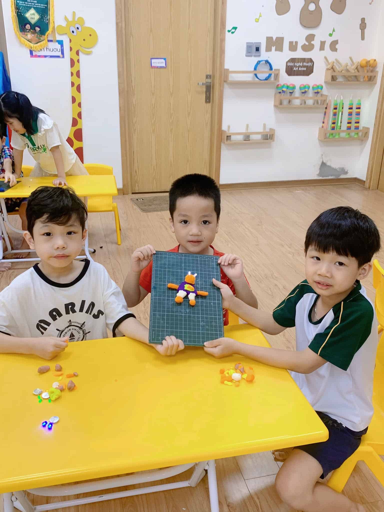 Đây là một trong những hoạt động được các bạn nhỏ rất yêu thích trong tiết học STEAM tuần này. Không chỉ có thêm một món đồ chơi thú vị, thông qua tiết học các bạn nhỏ đã biết thêm rất nhiều kiến thức về hình dạng đặc trưng của robot, cấu tạo và hoạt động của đèn LED…