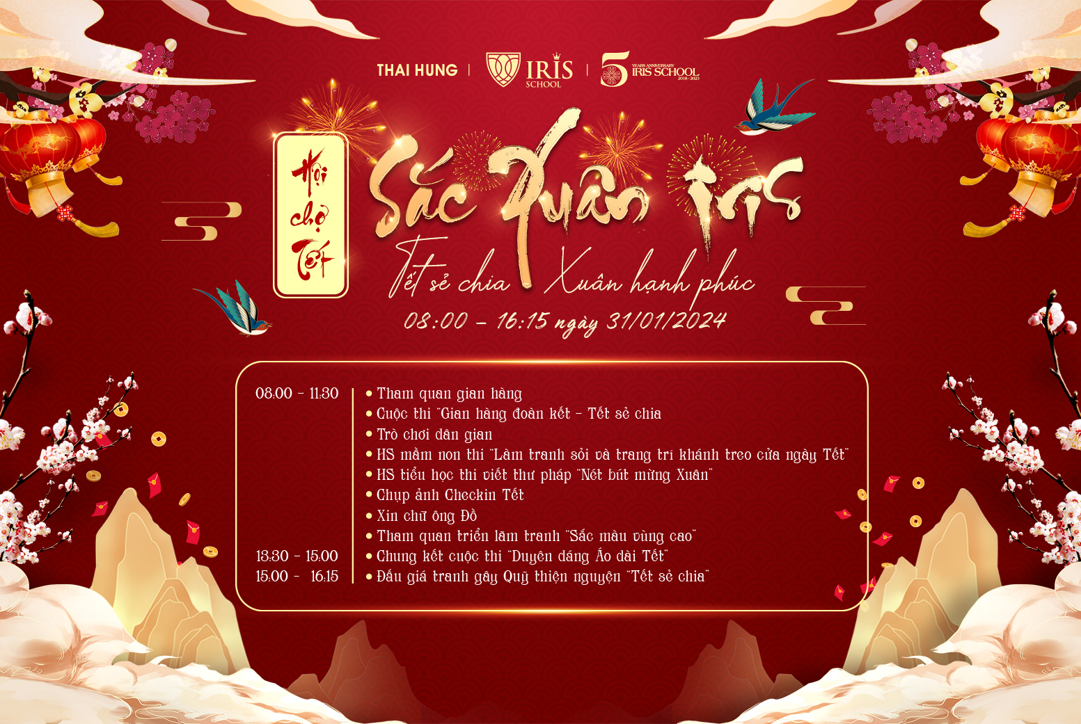 Hội chợ Tết Sắc Xuân Iris là hoạt động thường niên được Iris tổ chức mỗi dịp Tết đến Xuân về. Sau một năm với rất nhiều bộn bề lo toan, nhà trường hy vọng rằng ba mẹ và các con có một ngày đong đầy hạnh phúc, cùng tham gia các hoạt động truyền thống đặc sắc và chia sẻ những câu chuyện tâm tình, những kỷ niệm đáng nhớ về ngày Tết cổ truyền của dân tộc.