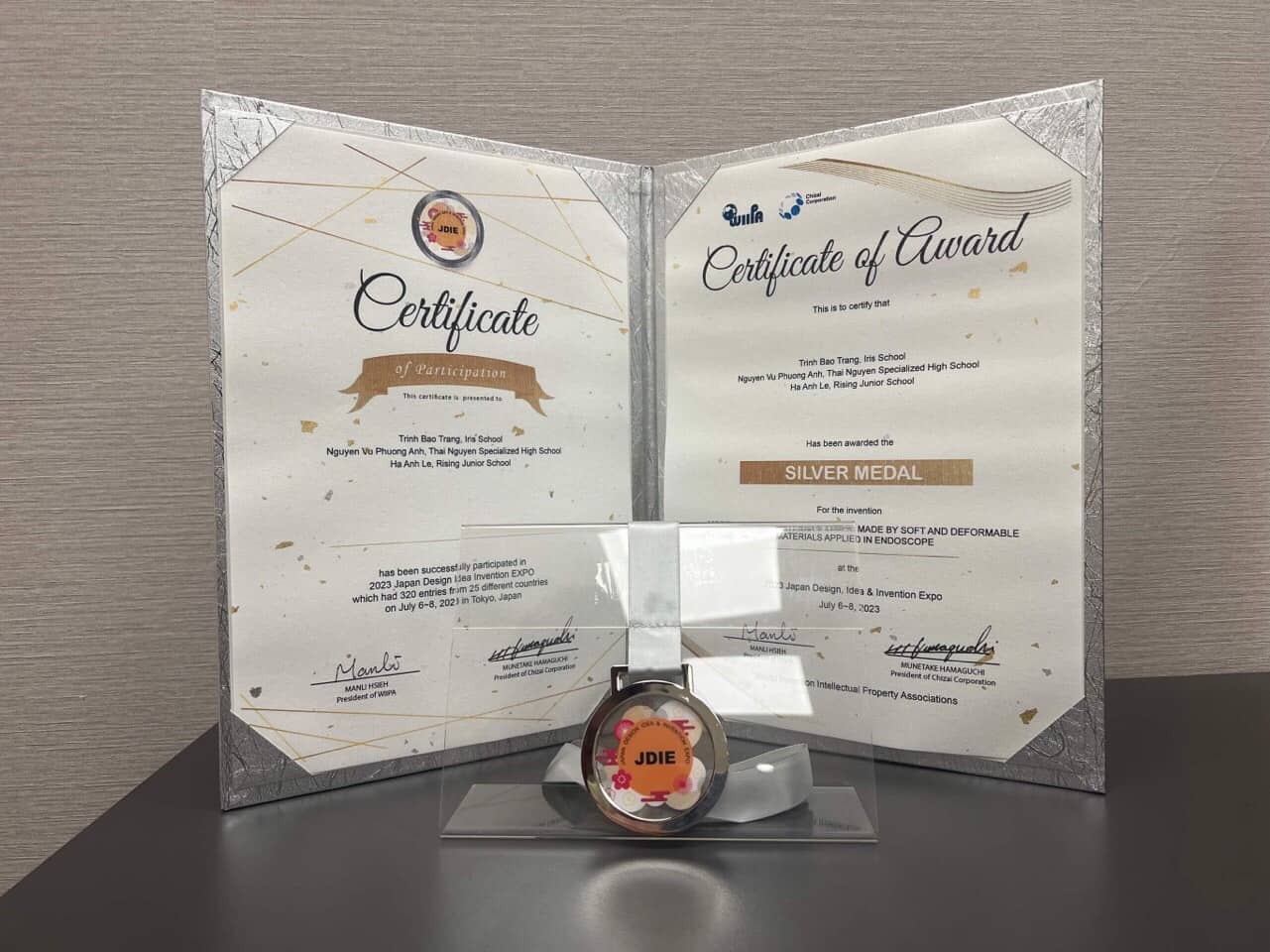 Sáng chế “Mô hình đầu dò linh hoạt từ vật liệu mềm hỗ trợ quá trình mổ nội soi” đã xuất sắc vượt qua gần 320 đội thi lứa tuổi học sinh – sinh viên đến từ hơn 25 quốc gia trên toàn thế giới để giành giải Bạc tại cuộc thi Japan Design, Idea and Invention Expo 2023 (Triển lãm Thiết kế và Phát minh Nhật Bản 2023) được tổ chức tại Tokyo.