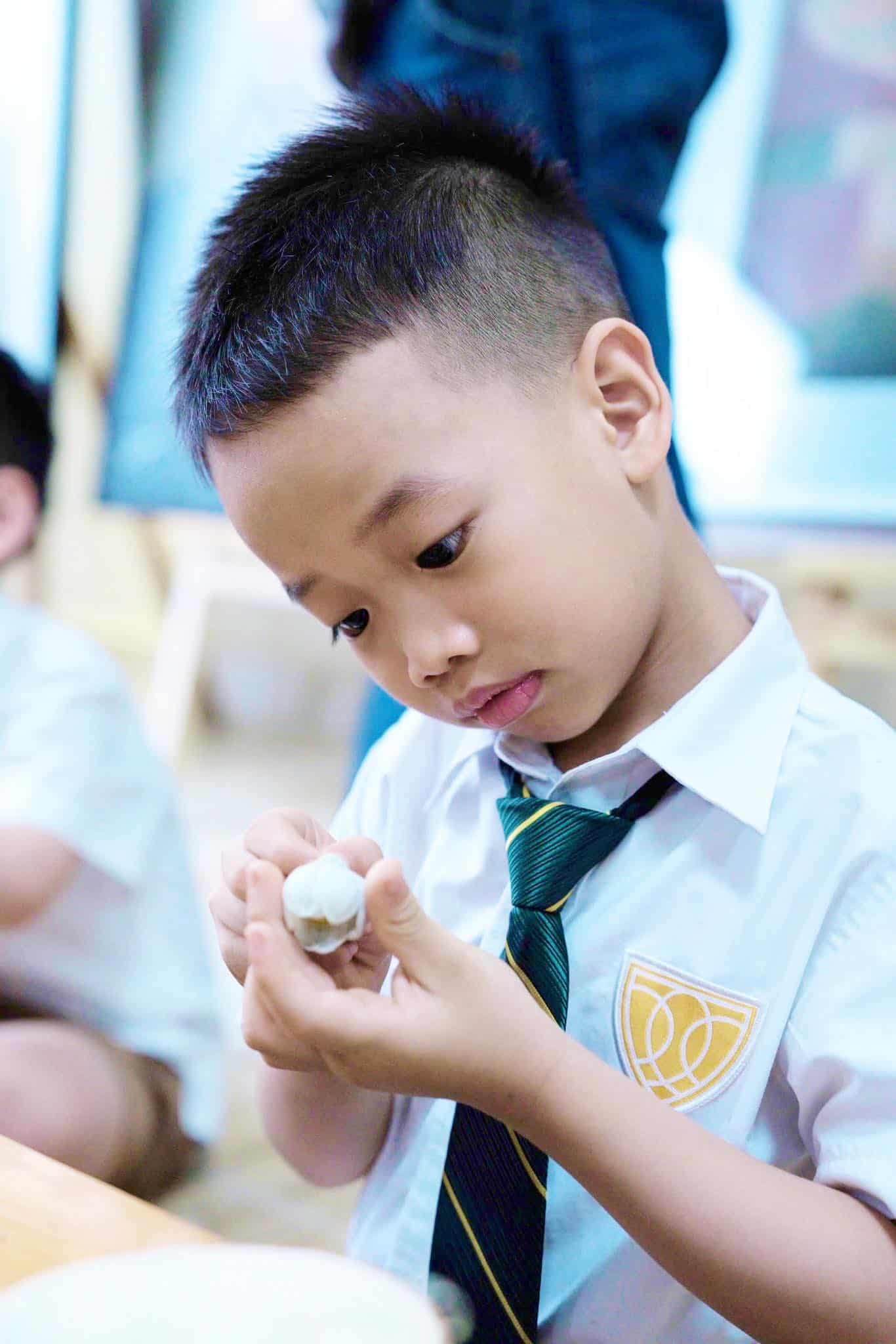 Không chỉ thưởng thức tranh, các bạn nhỏ còn được trực tiếp trải nghiệm hoạt động làm hoa trà – loài hoa tượng trưng cho sự tinh khiết và bền bỉ bằng đôi bàn tay khéo léo của mình.