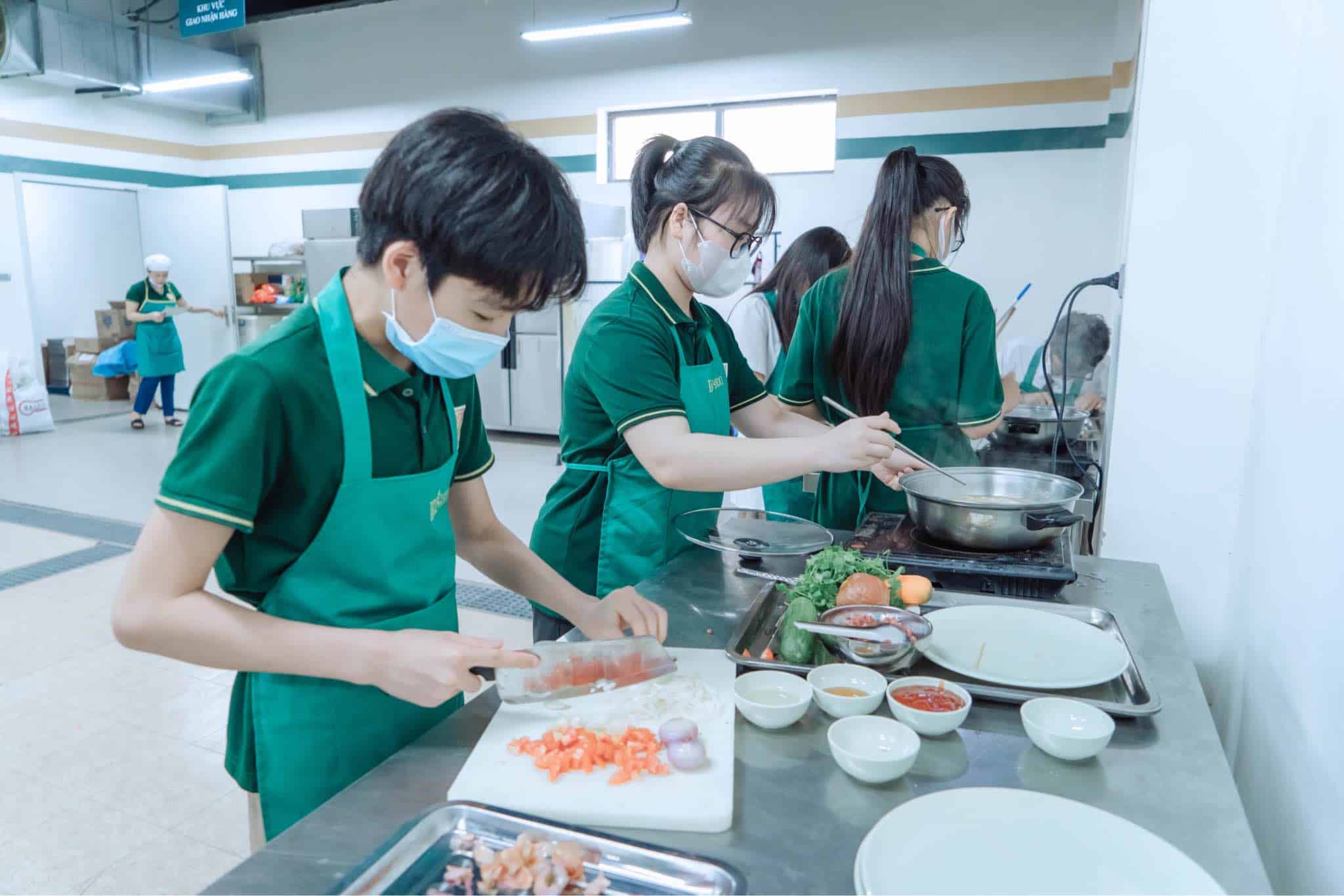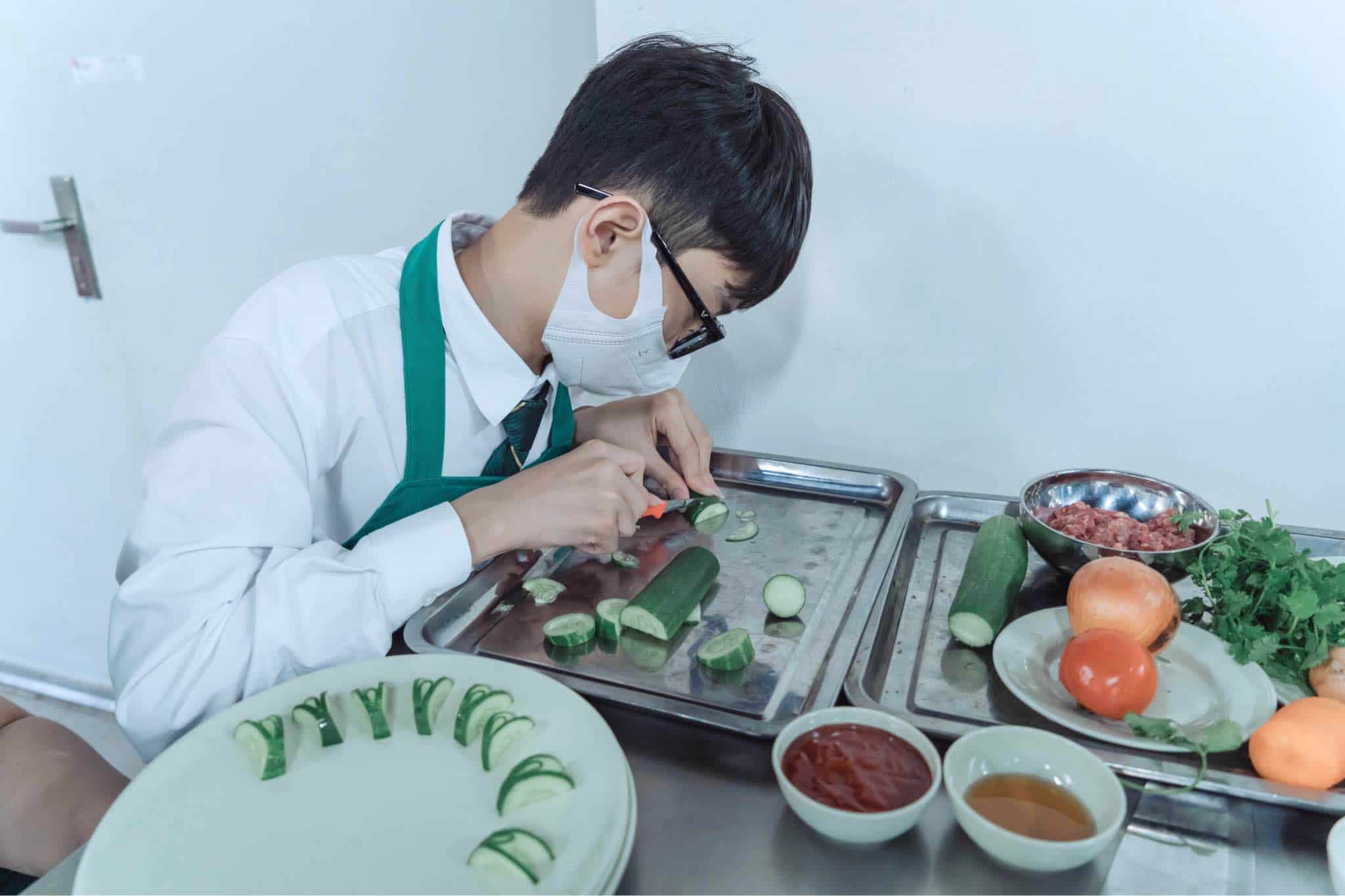 Trong vai trò đầu bếp, các con đều rất hào hứng khi được tự tay chuẩn bị món ăn mà mình yêu thích. Các công đoạn từ sơ chế nguyên liệu, chế biến đến cắt tỉa hoa trang trí… đều được các bạn trong nhóm phân công thực hiện.