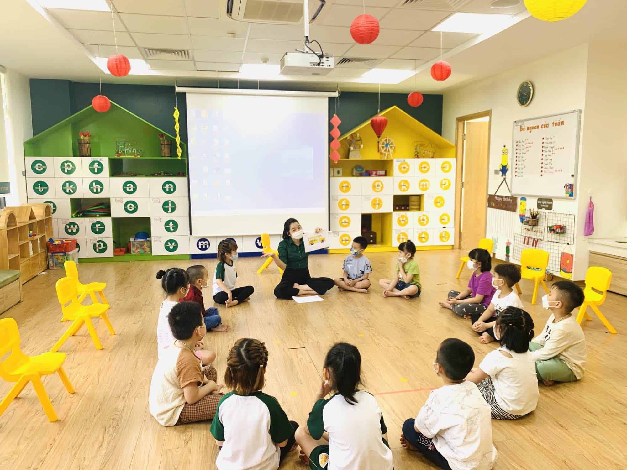 Trong tiến trình phát triển tự nhiên của trẻ, 3 đến 6 tuổi là thời kỳ trẻ phát triển “rực rỡ” nhất về ngôn ngữ. Chính vì vậy, bên cạnh việc giúp trẻ làm giàu vốn ngôn ngữ mẹ đẻ thì việc giúp các con làm quen với ngoại ngữ luôn được Trường Mầm non Iris đặc biệt coi trọng. Ở độ tuổi này, các con thường đặc biệt hứng thú với những hình ảnh và âm thanh vui nhộn. Cho nên, ở các giờ học ngoại ngữ ở Trường Mầm non Iris, các thầy cô giáo thường tận dụng điều này để khơi dậy tiềm năng ngôn ngữ ở các con.