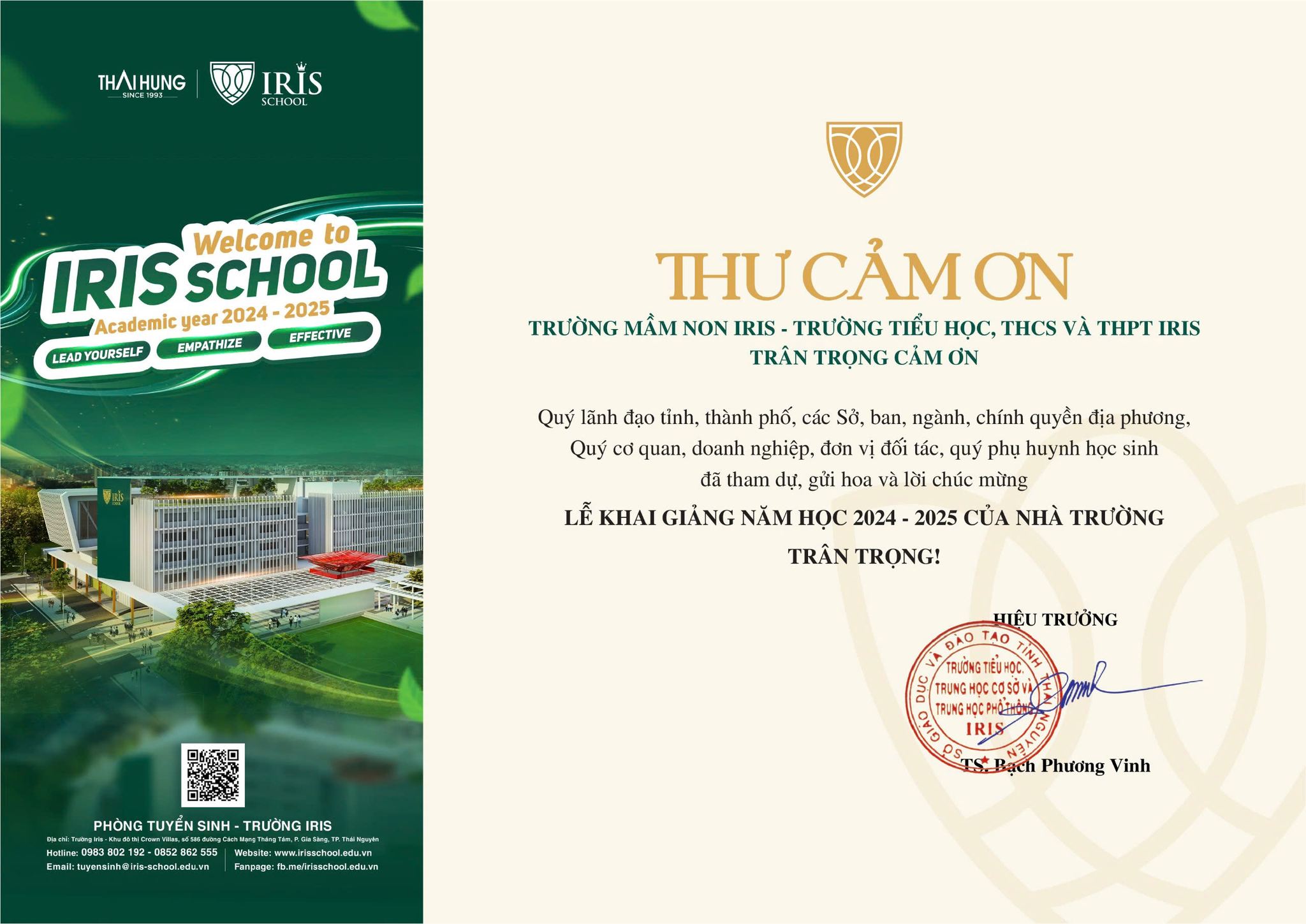 Nhân dịp này, Trường Iris xin trân trọng gửi lời cảm ơn sâu sắc đến Quý lãnh đạo tỉnh, thành phố, các Sở, ban, ngành, chính quyền địa phương, Quý cơ quan, doanh nghiệp, đơn vị đối tác, cùng Quý phụ huynh học sinh đã dành thời gian quý báu tham dự, gửi hoa và những lời chúc mừng tốt đẹp đến nhà trường trong buổi Lễ khai giảng năm học 2024 – 2025.