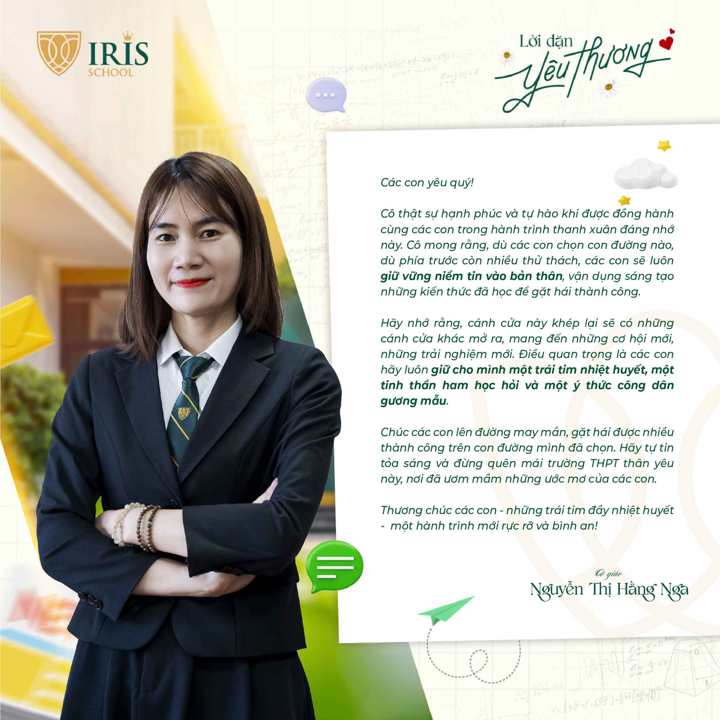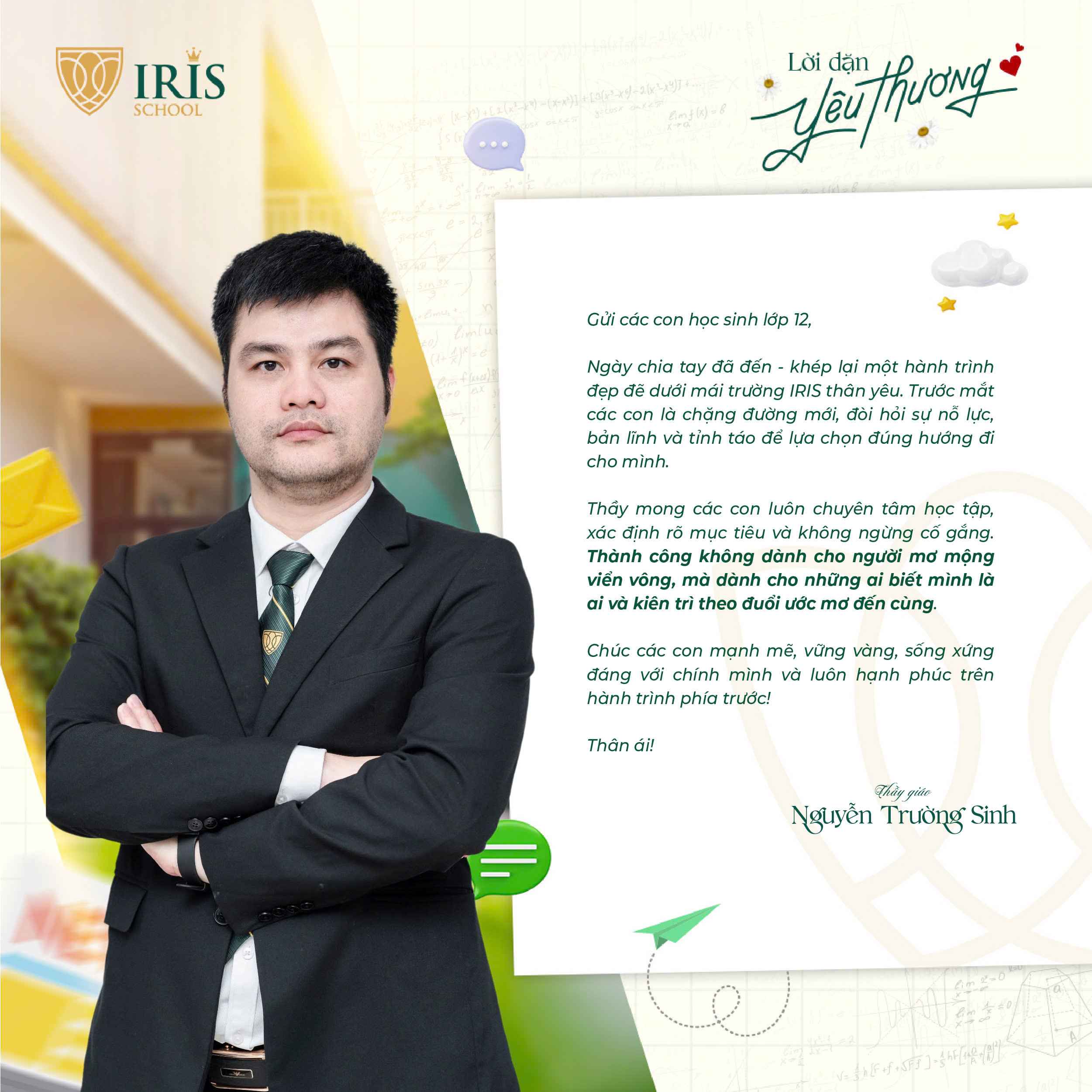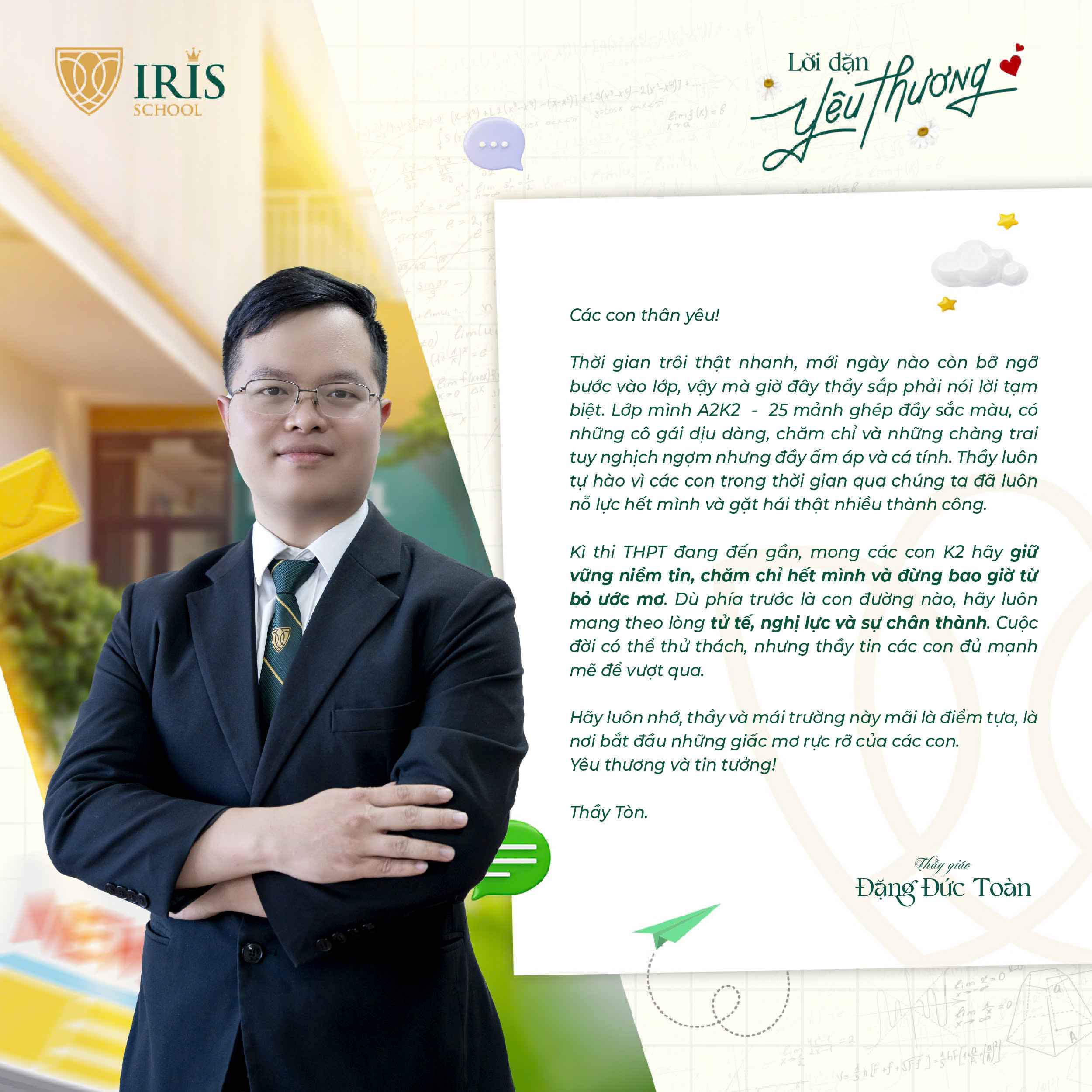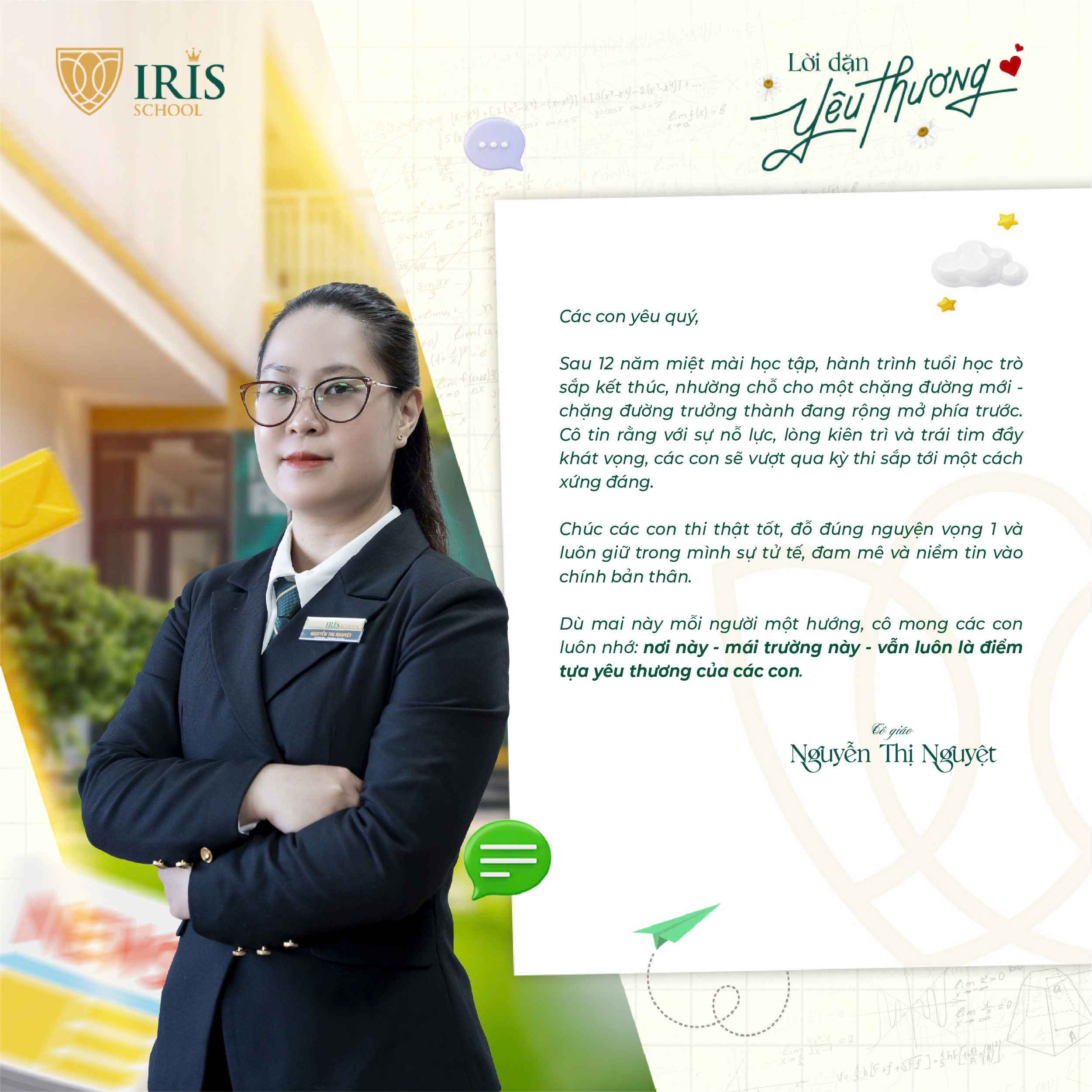 Trước khi Irisers khối 12 chính thức bước vào kỳ thi tốt nghiệp THPT, một dấu mốc quan trọng khép lại hành trình 12 năm đèn sách và mở ra cánh cửa tương lai, các thầy cô cấp THPT đã gửi đến các con những lời nhắn nhủ đầy yêu thương và tự hào. Có những điều chưa kịp nói trong những tiết học cuối, nay lặng lẽ được trao gửi qua từng dòng chữ giản dị mà sâu sắc.