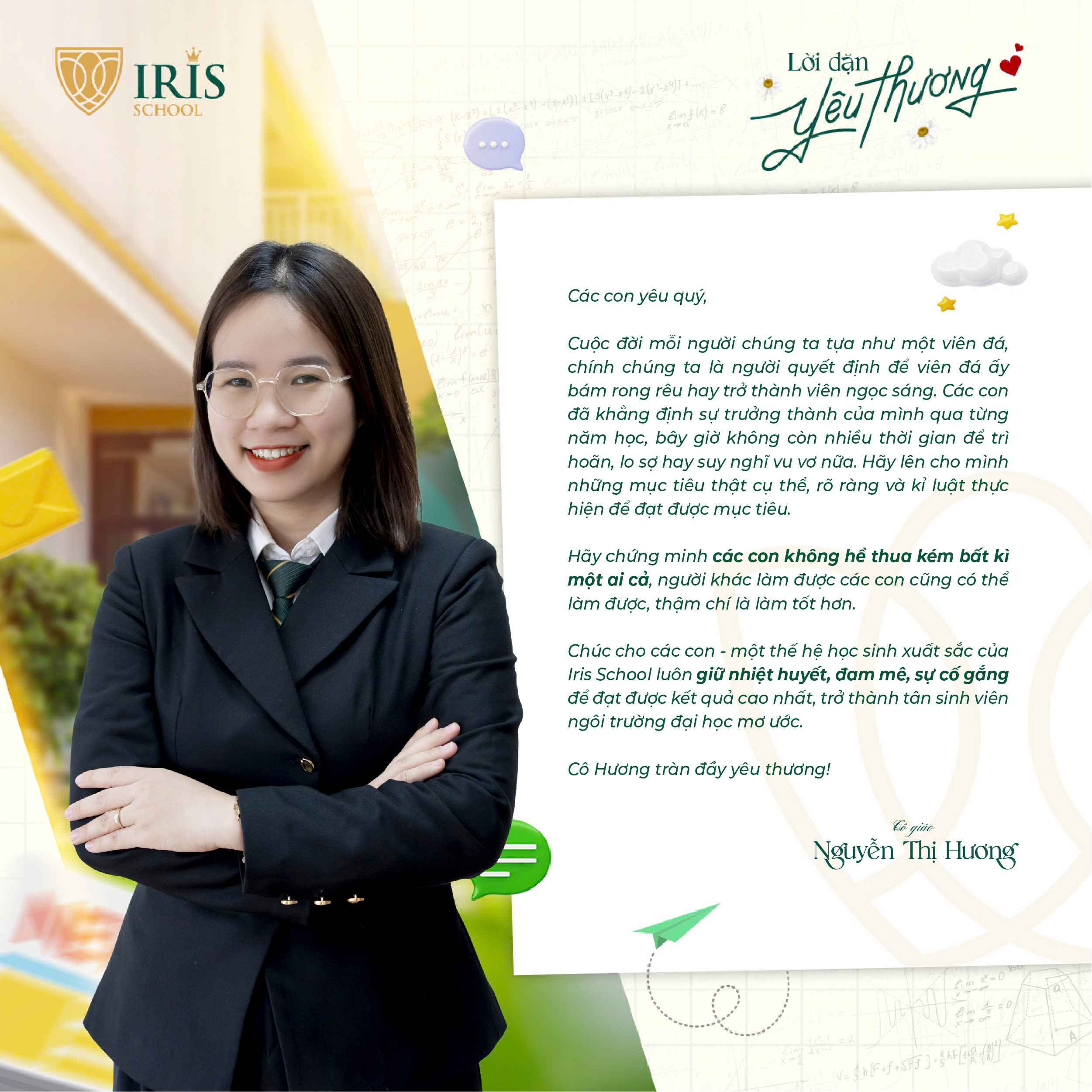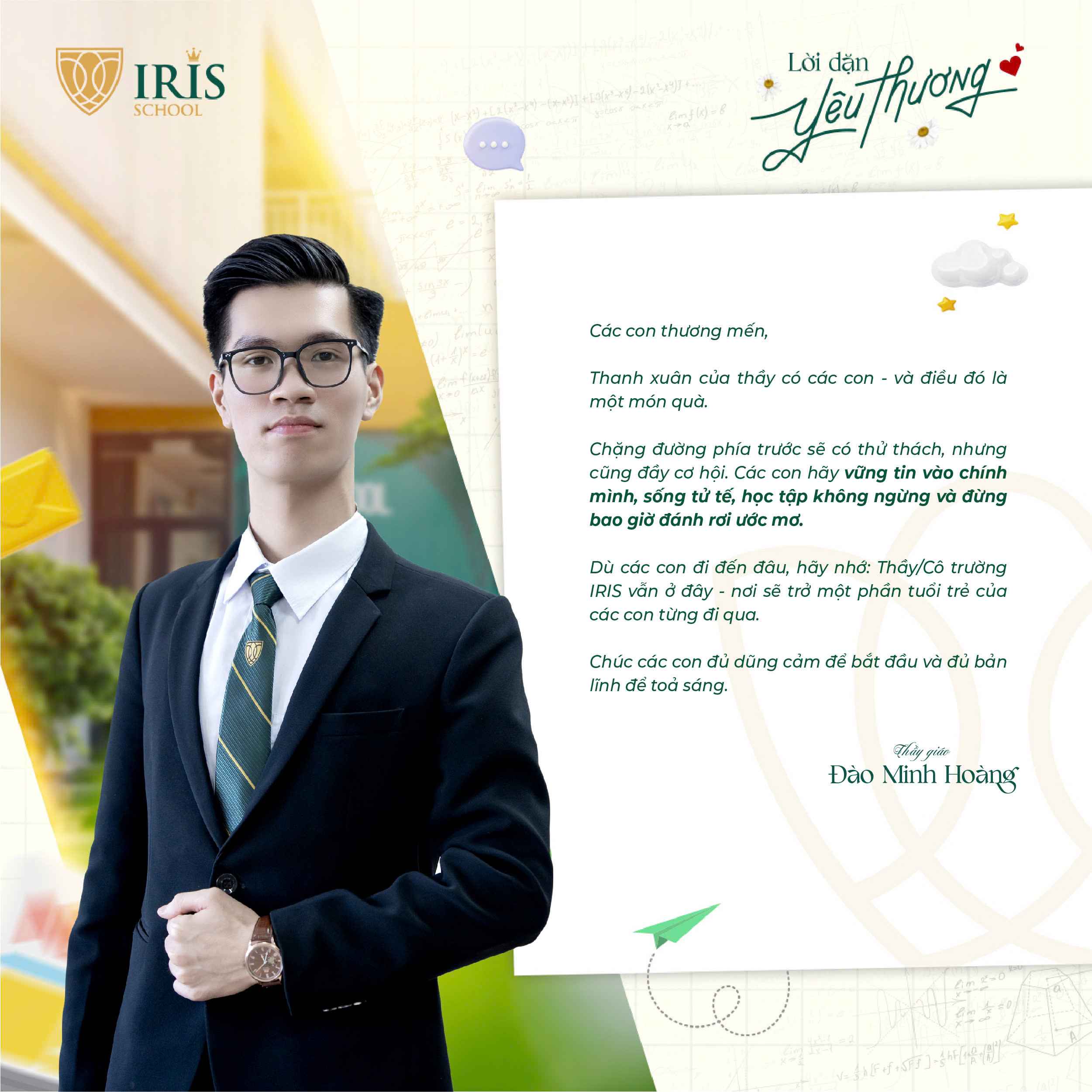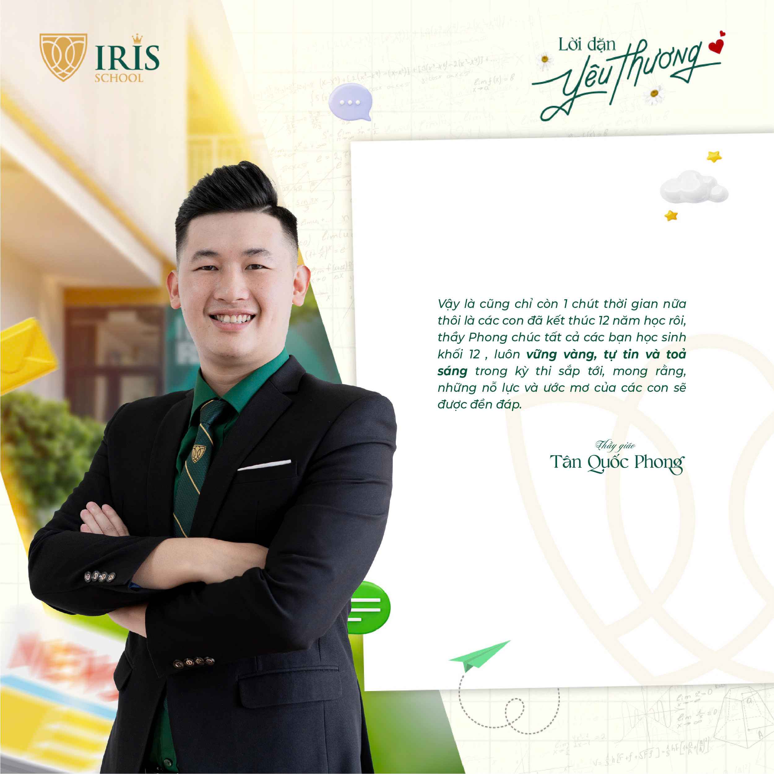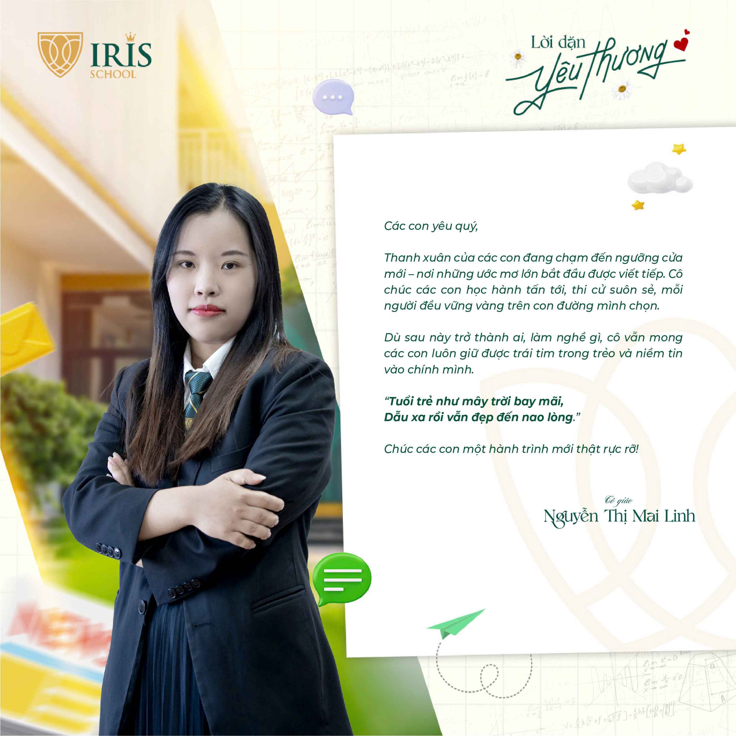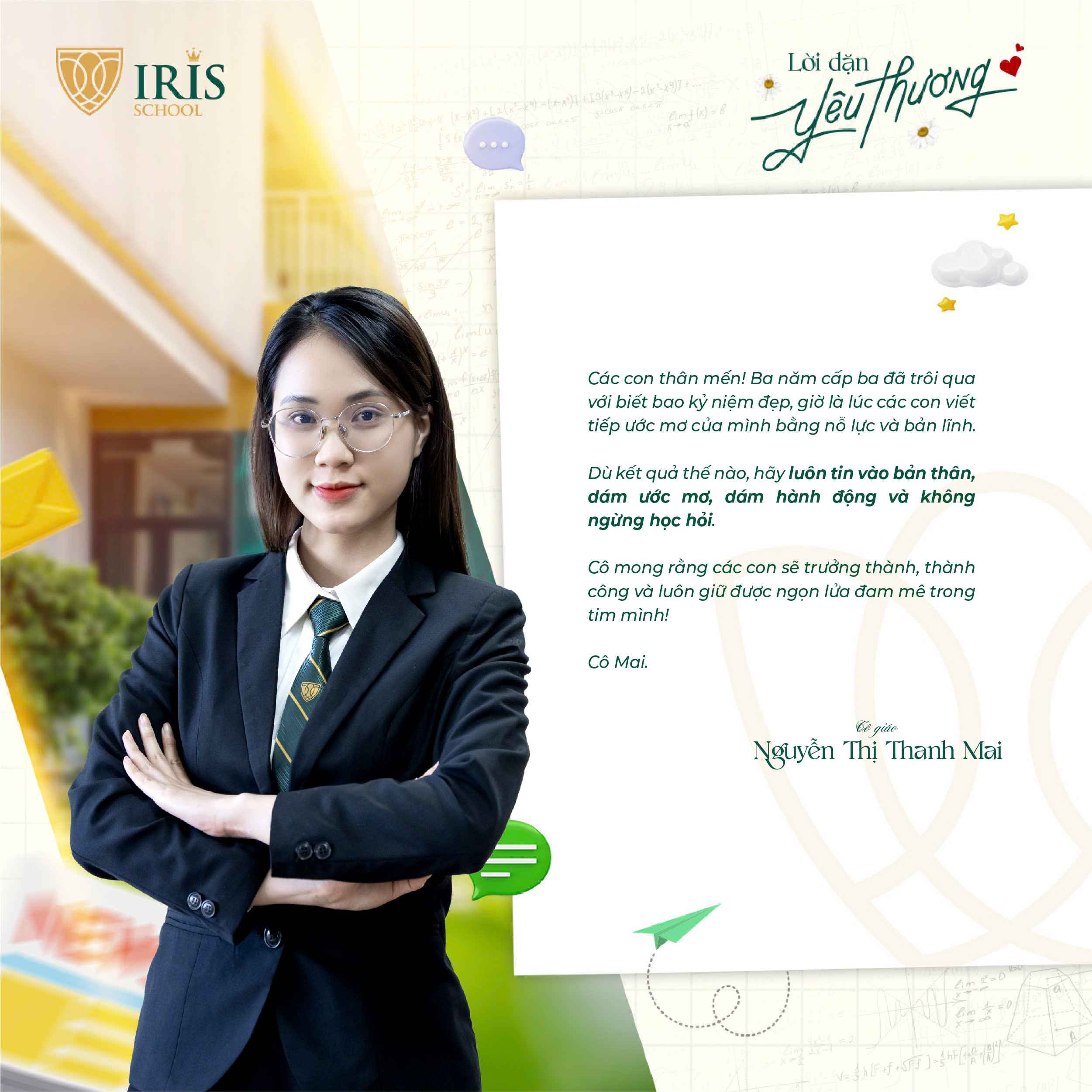 Trước khi Irisers khối 12 chính thức bước vào kỳ thi tốt nghiệp THPT, một dấu mốc quan trọng khép lại hành trình 12 năm đèn sách và mở ra cánh cửa tương lai, các thầy cô cấp THPT đã gửi đến các con những lời nhắn nhủ đầy yêu thương và tự hào. Có những điều chưa kịp nói trong những tiết học cuối, nay lặng lẽ được trao gửi qua từng dòng chữ giản dị mà sâu sắc.