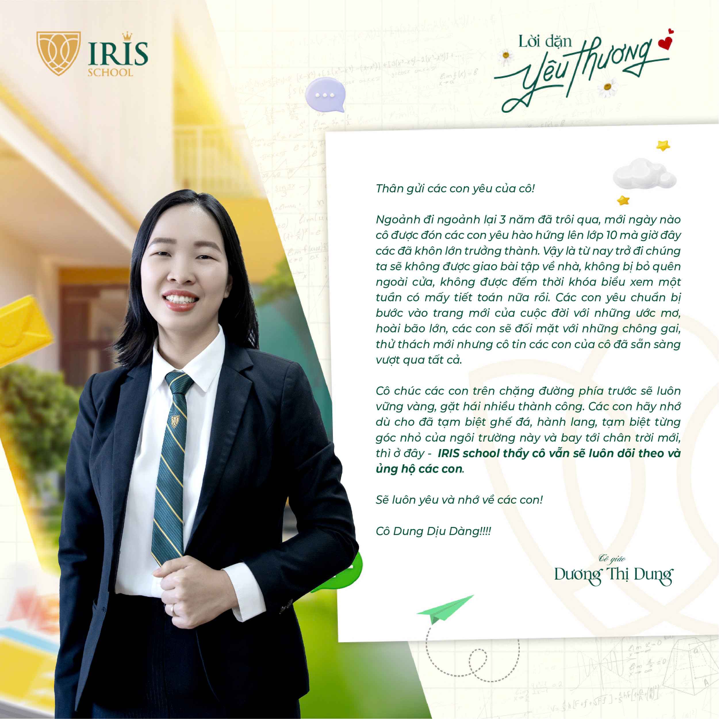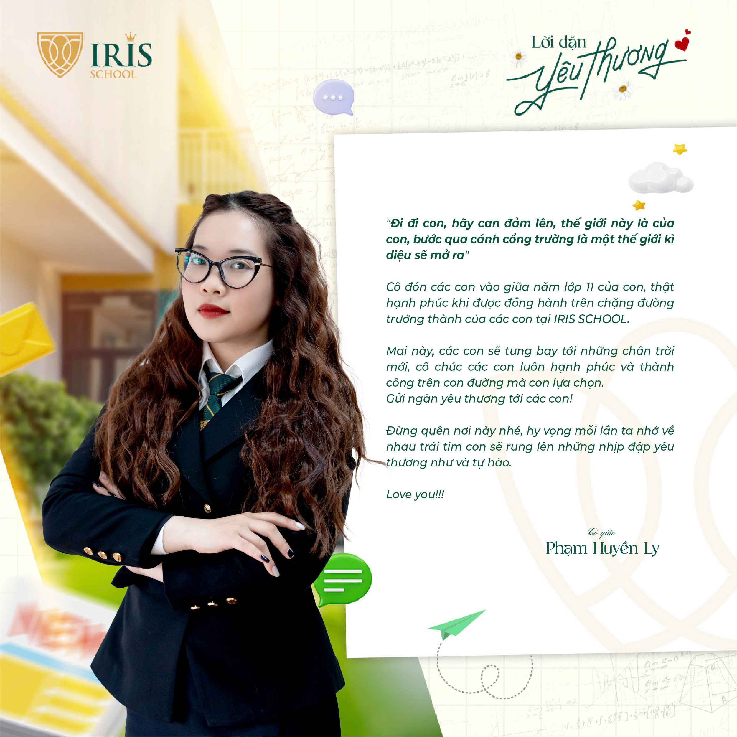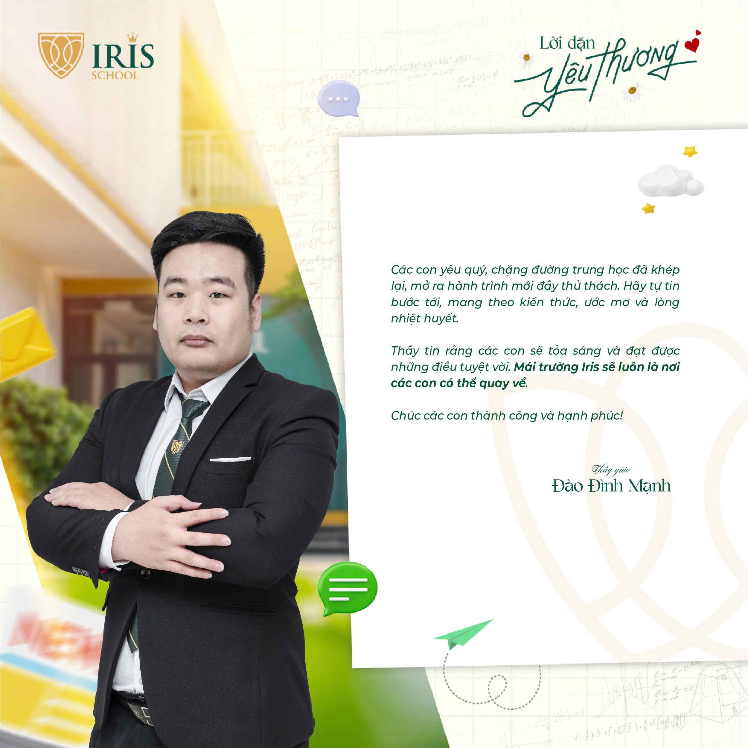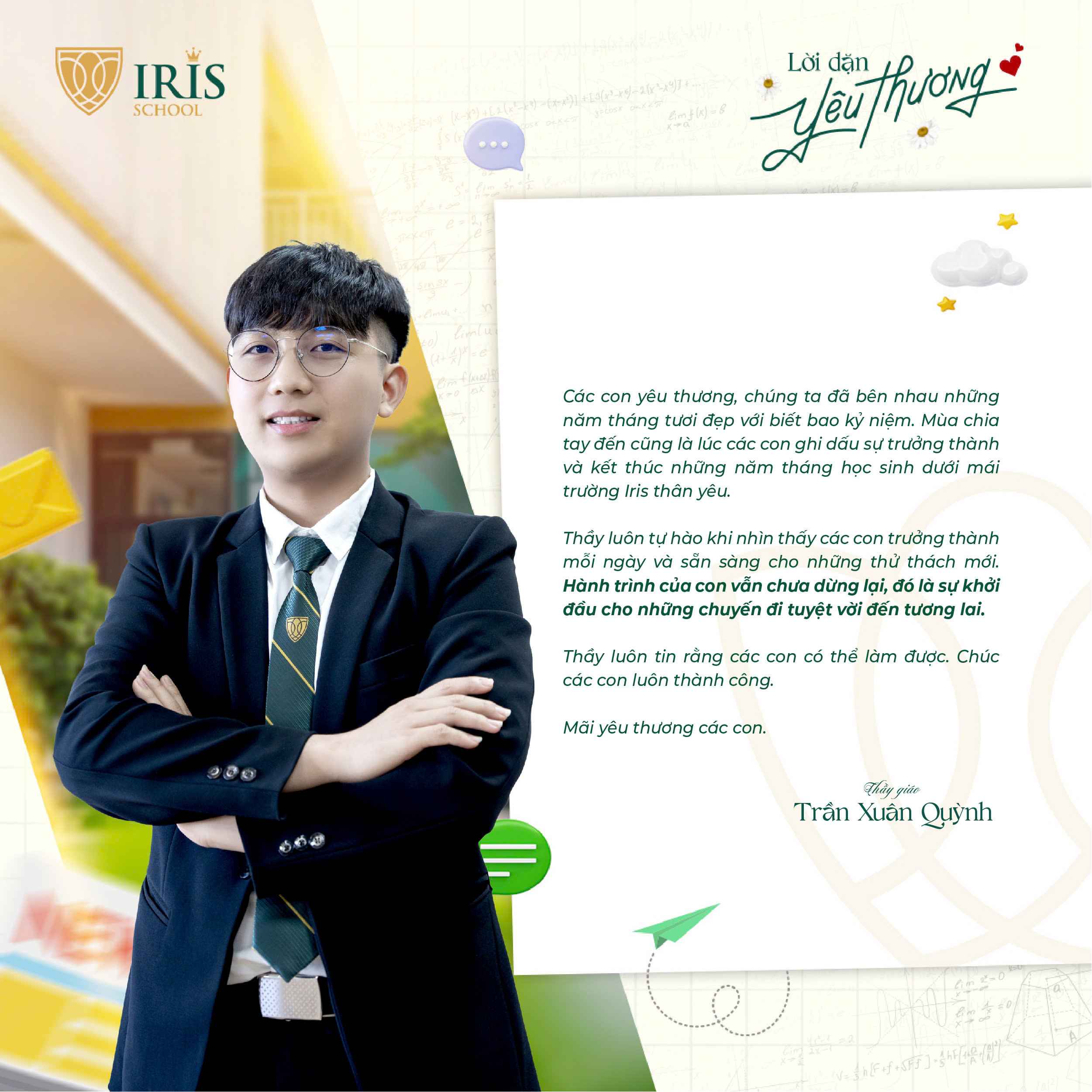 Trước khi Irisers khối 12 chính thức bước vào kỳ thi tốt nghiệp THPT, một dấu mốc quan trọng khép lại hành trình 12 năm đèn sách và mở ra cánh cửa tương lai, các thầy cô cấp THPT đã gửi đến các con những lời nhắn nhủ đầy yêu thương và tự hào. Có những điều chưa kịp nói trong những tiết học cuối, nay lặng lẽ được trao gửi qua từng dòng chữ giản dị mà sâu sắc.