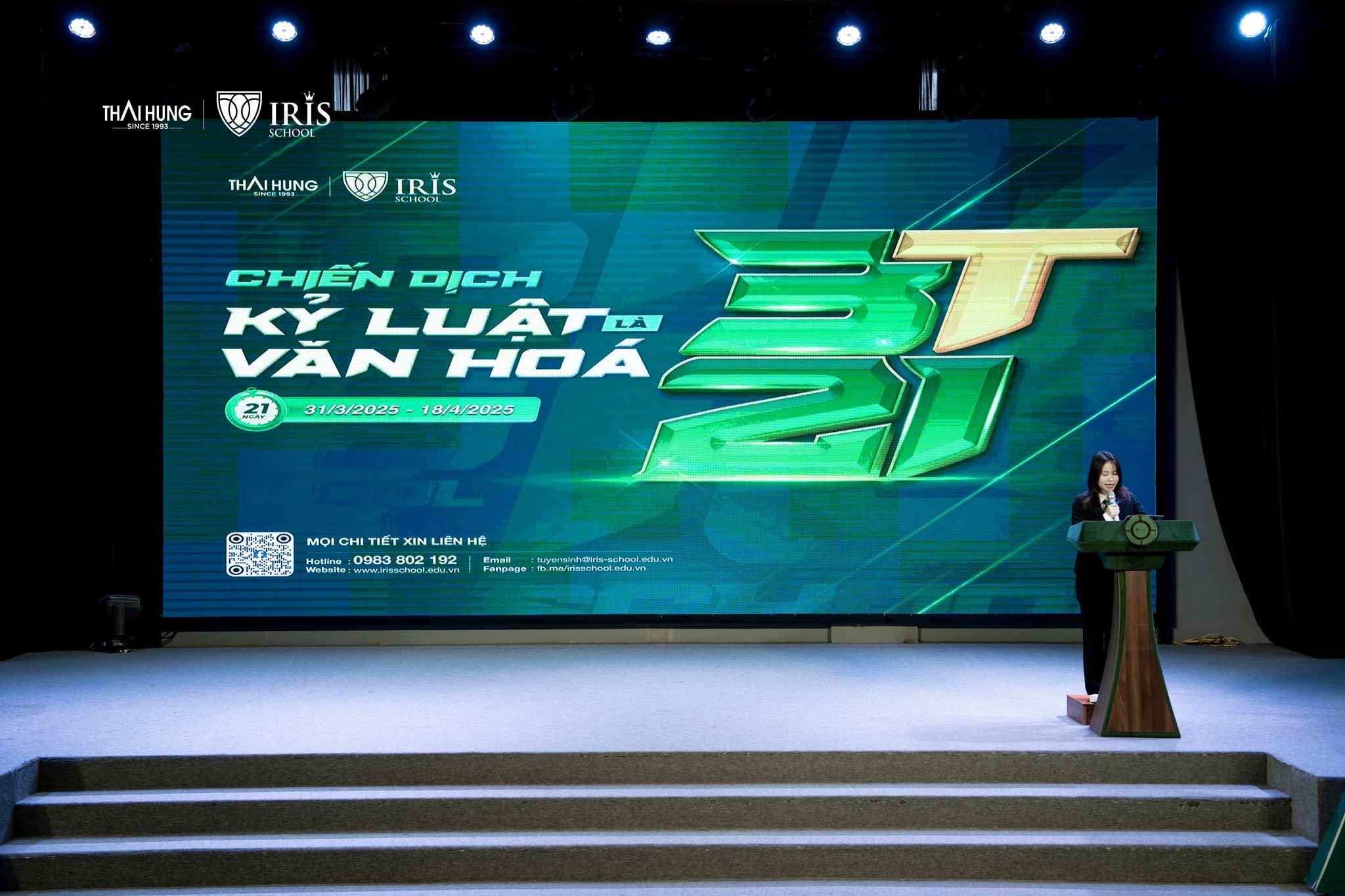 Buổi chào cờ tuần này tại Trường Iris đánh dấu sự khởi động của chiến dịch 3T21 – Kỷ luật là văn hoá. Đó cũng chính là là thông điệp xuyên suốt, giúp mỗi Iriser rèn luyện thói quen tốt, xây dựng môi trường học tập tích cực và văn minh hơn. Mỗi hành động nhỏ, mỗi sự tự giác trong học tập và sinh hoạt đều góp phần tạo nên văn hoá kỷ luật vững mạnh tại ngôi nhà chung Iris.