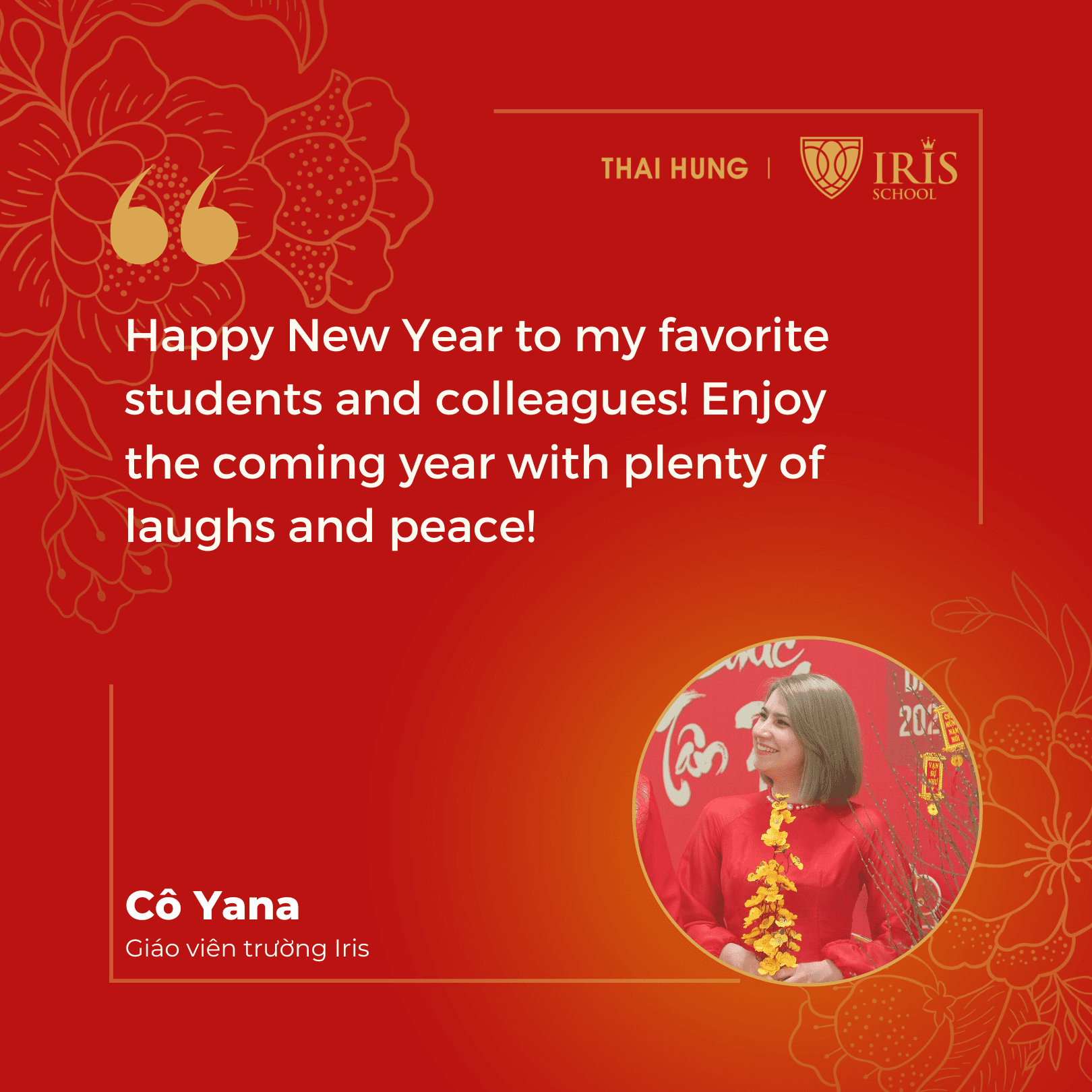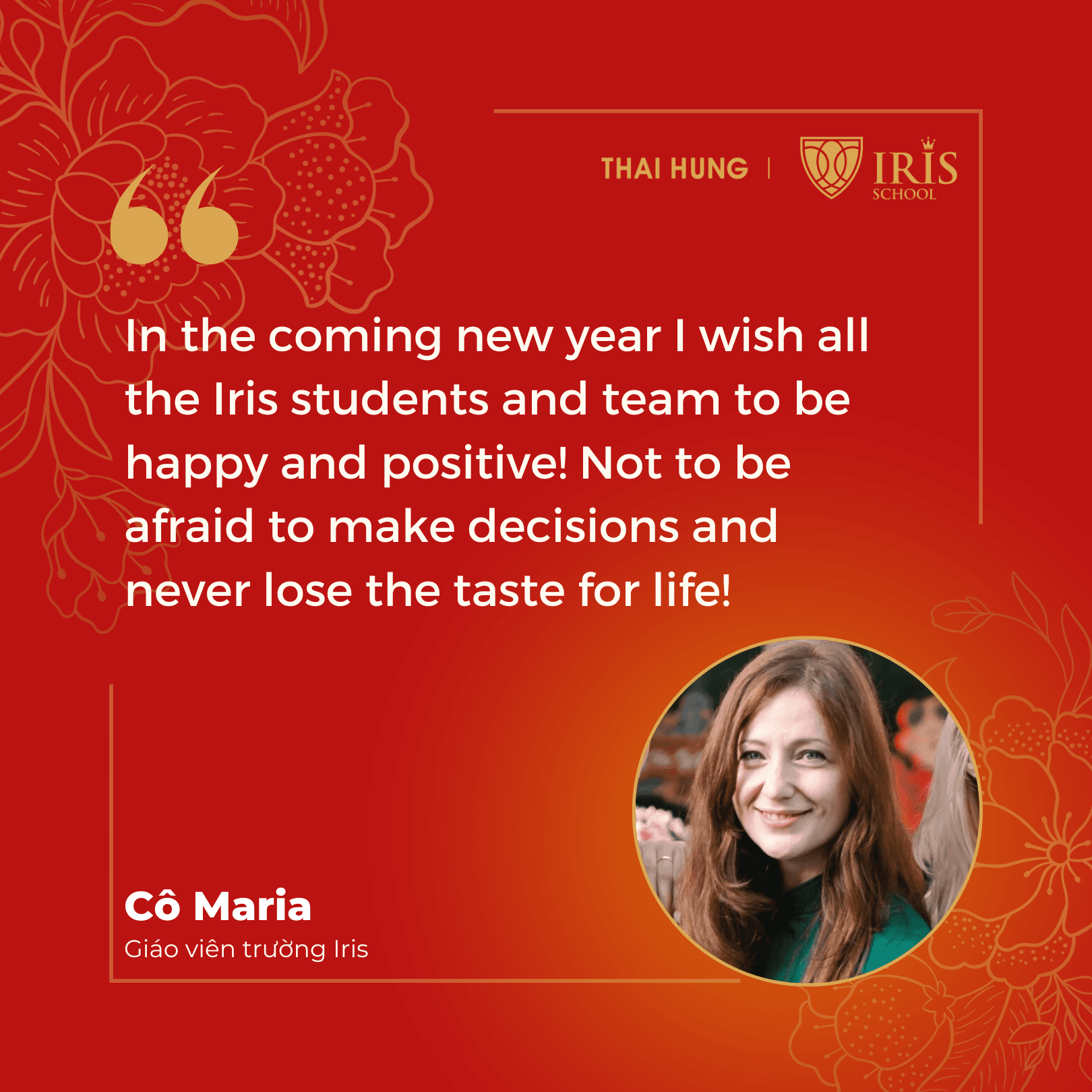 Năm mới tới, cô Maria cũng chúc các bạn học sinh và tập thể Iris School luôn vui vẻ và tích cực! Không ngại đưa ra quyết định và không bao giờ đánh mất hương vị của cuộc sống!”
