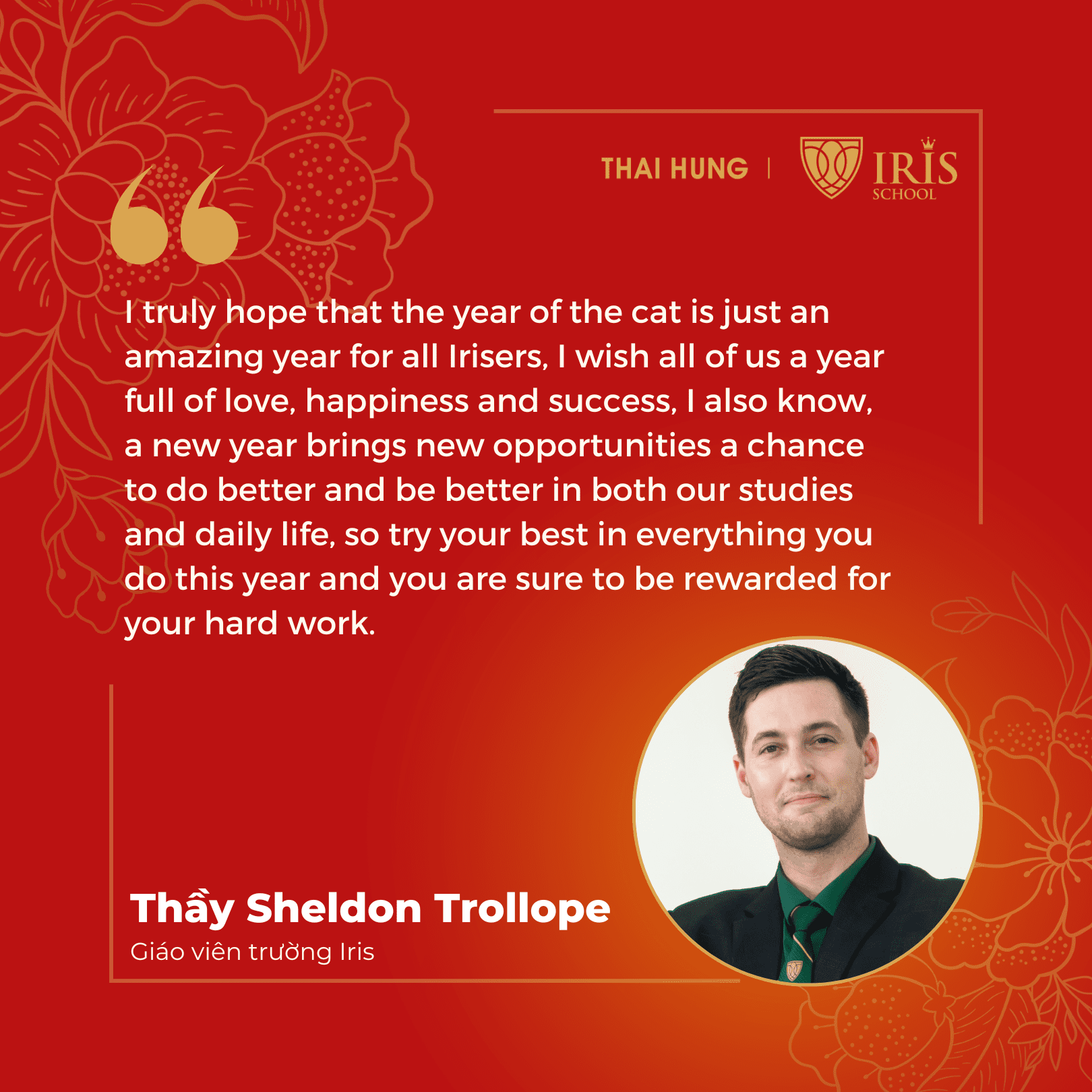 Năm Quý Mão 2023, thầy thực sự hy vọng rằng năm con mèo sẽ là một năm tuyệt vời cho tất cả các Irisers, thầy chúc tất cả các con một năm tràn đầy tình yêu, hạnh phúc và thành công. Thầy cũng biết, một năm mới mang đến những cơ hội mới, cơ hội để làm tốt hơn trong học tập cũng như cuộc sống hàng ngày, vì vậy hãy cố gắng hết sức trong mọi việc các con làm trong năm nay và chắc chắn các con sẽ được đền đáp xứng đáng cho sự chăm chỉ của mình.