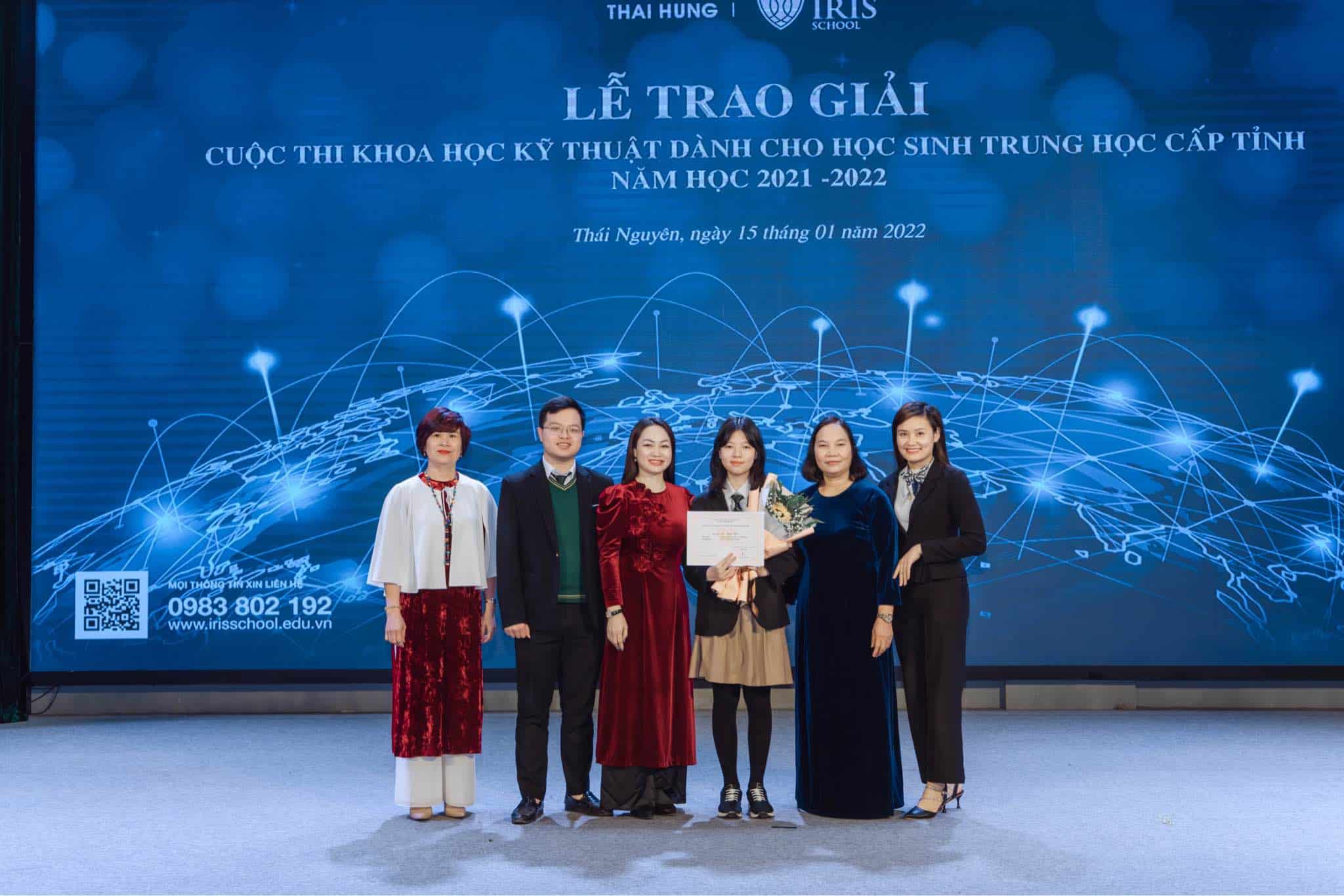 Thầy Đặng Đức Toàn và các thầy cô chụp ảnh lưu niệm cùng em Hà Minh Hiền tại Lễ trao giải cuộc thi Khoa học kỹ thuật dành cho học sinh Trung học cấp tỉnh năm học 2021-2022