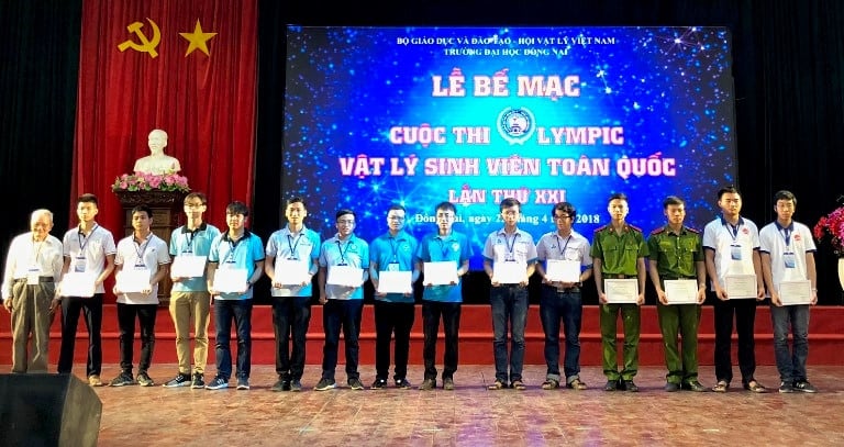 Thầy Đặng Đức Toàn (thứ 8 từ trái sang) nhận Giải thưởng Cuộc thi Olympic Vật lý sinh viên toàn quốc