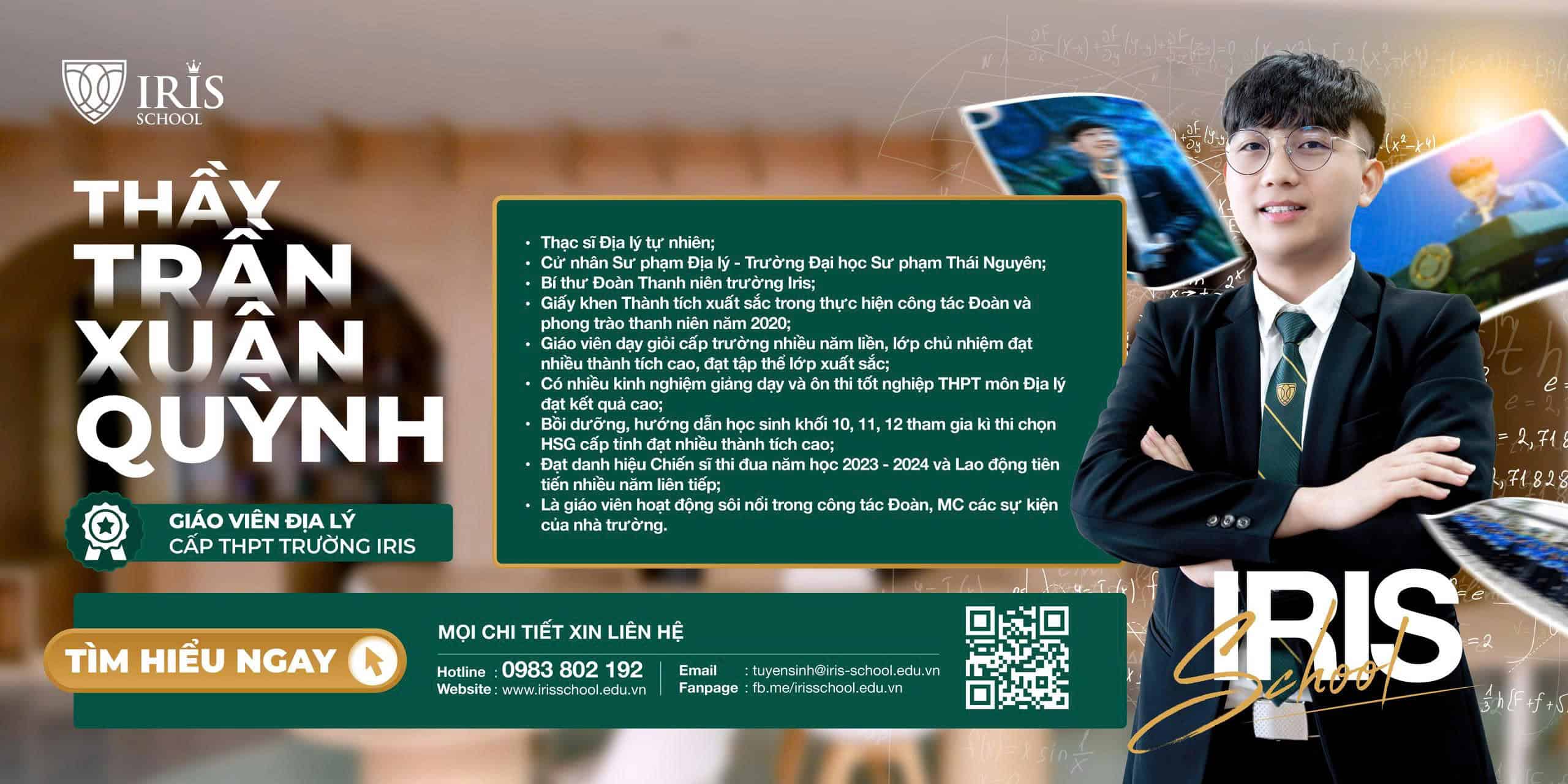 Những câu thơ dí dỏm trên đang gợi nhắc đến thầy Trần Xuân Quỳnh – giáo viên Địa lý cấp THPT, Bí thư Đoàn Thanh niên trường Iris như một lời tri ân và ngưỡng mộ dành cho người thầy đặc biệt không chỉ bởi bài giảng sinh động, dễ hiểu mà còn bởi tâm huyết, đam mê và tinh thần đổi mới không ngừng nghỉ mà thầy mang theo trên hành trình gieo chữ và đồng hành cùng học sinh.