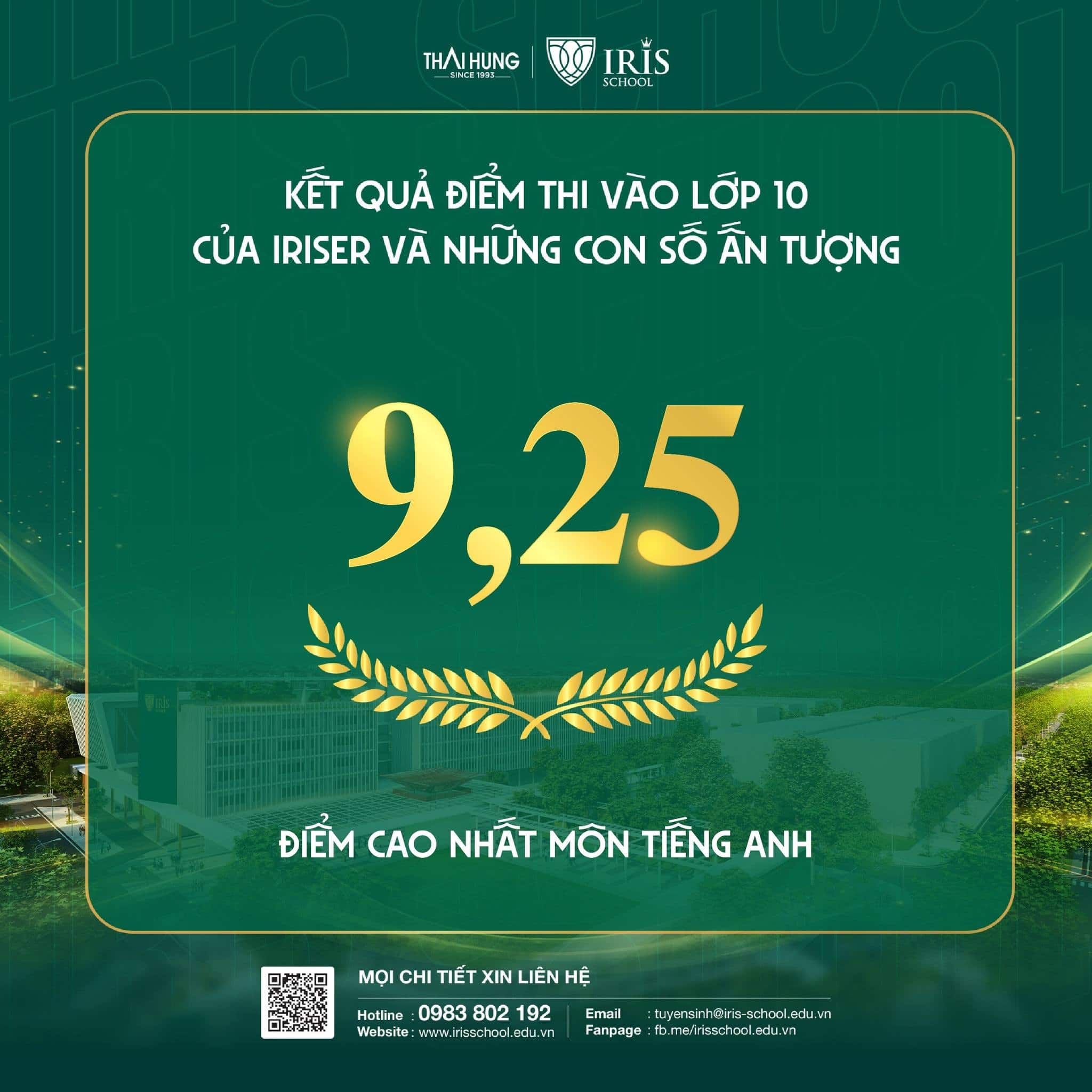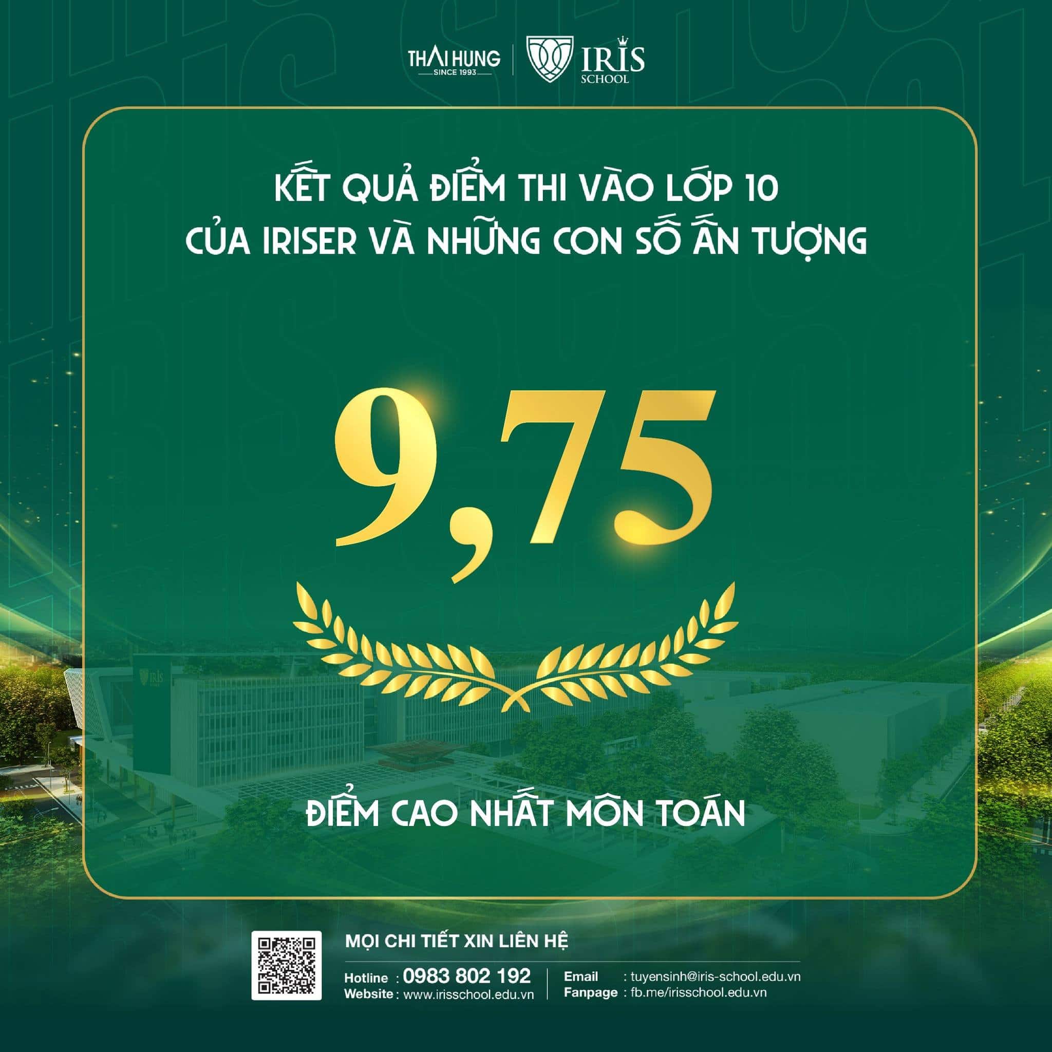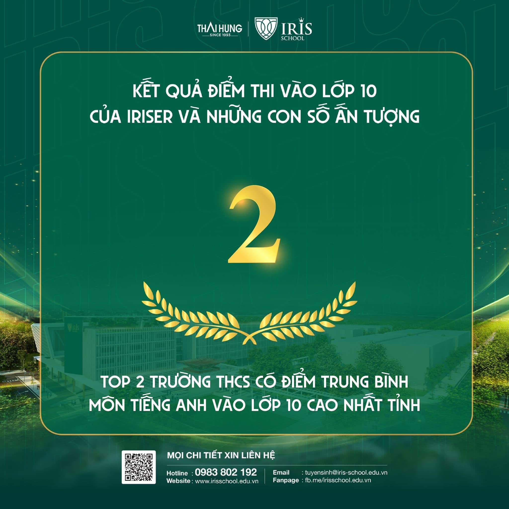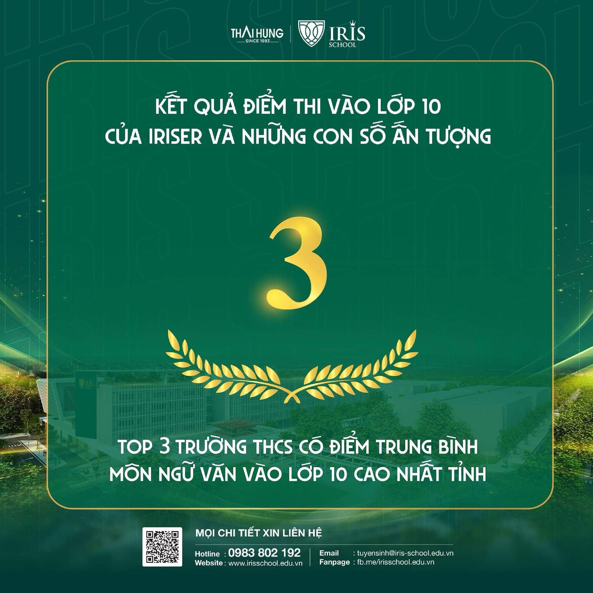 Chúc mừng Irisers khối 9 đã xuất sắc vượt qua kỳ thi tuyển sinh vào lớp 10 với số điểm rất ấn tượng. Trường Iris vô cùng tự hào với thành tích Top 3 trường có điểm trung bình các môn thi vào lớp 10 cao nhất tỉnh Thái Nguyên. Mặc dù với đặc thù là trường liên cấp, phần lớn Irisers chọn tiếp tục theo học cấp THPT tại Trường Iris nhưng với sự chăm chỉ, nỗ lực hết mình các Irisers tham gia kỳ thi đều giành số điểm như mong đợi.