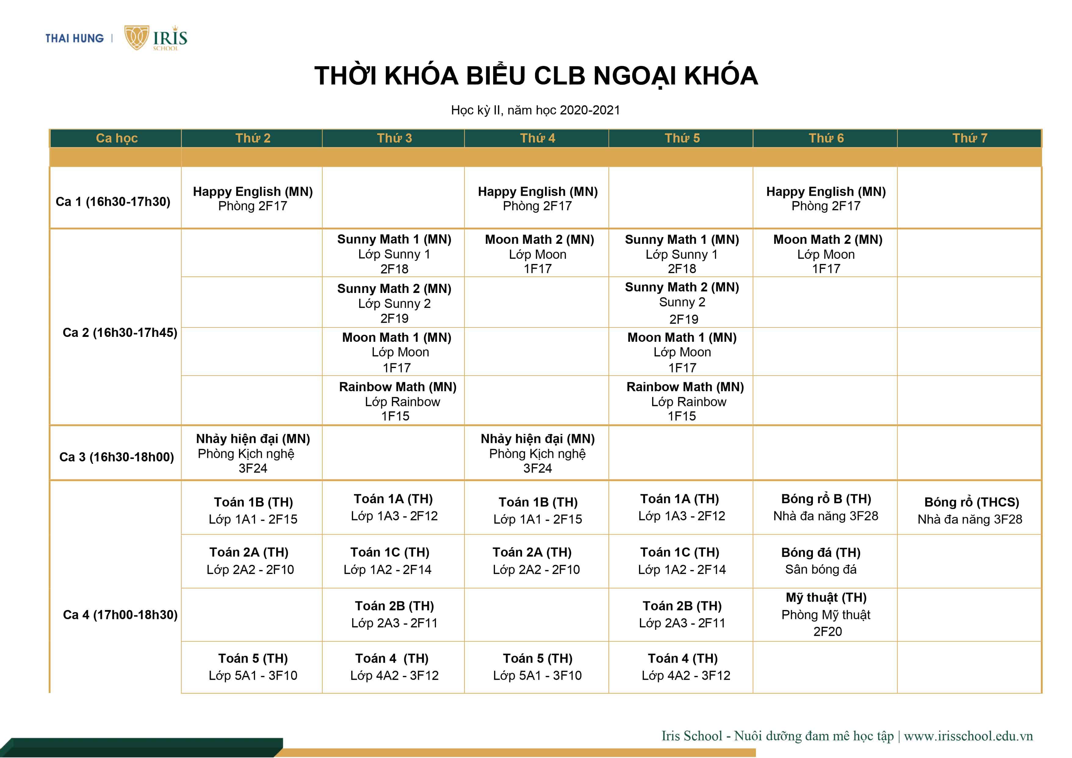 Kính gửi Quý phụ huynh và các em học sinh Thời khóa biểu Câu lạc bộ Ngoại khóa học kỳ II năm học 2020-2021.