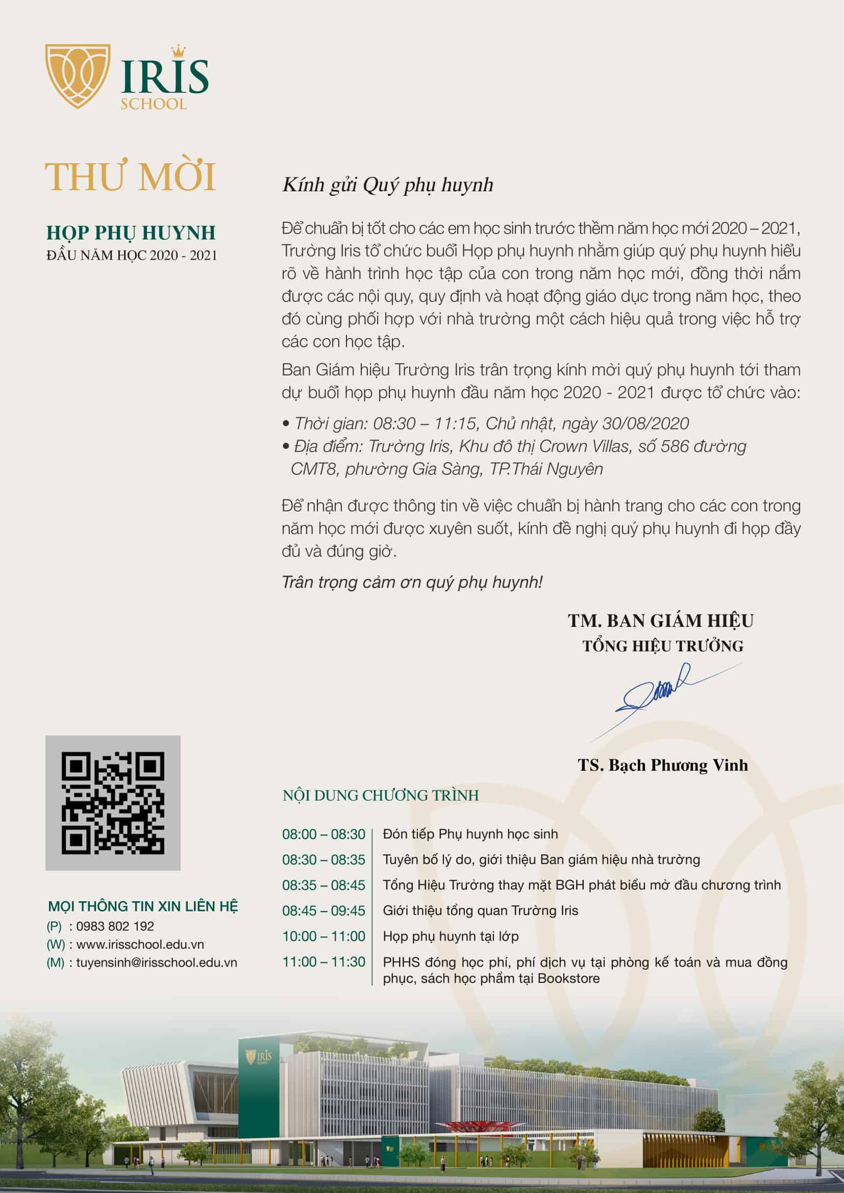 Để chuẩn bị tốt nhất cho các em học sinh trước thềm năm học mới 2020 – 2021, Trường Iris tổ chức buổi Họp phụ huynh nhằm giúp quý phụ huynh hiểu rõ về hành trình học tập của con trong năm học mới, đồng thời nắm được các nội quy nhà trường, hoạt động giáo dục trong năm học và phối hợp cùng nhà trường một cách hiệu quả trong quá trình hỗ trợ các con học tập, Ban Giám hiệu Trường Iris trân trọng kính mời quý phụ huynh tới tham dự buổi họp phụ huynh đầu năm học 2020 – 2021 được tổ chức vào: