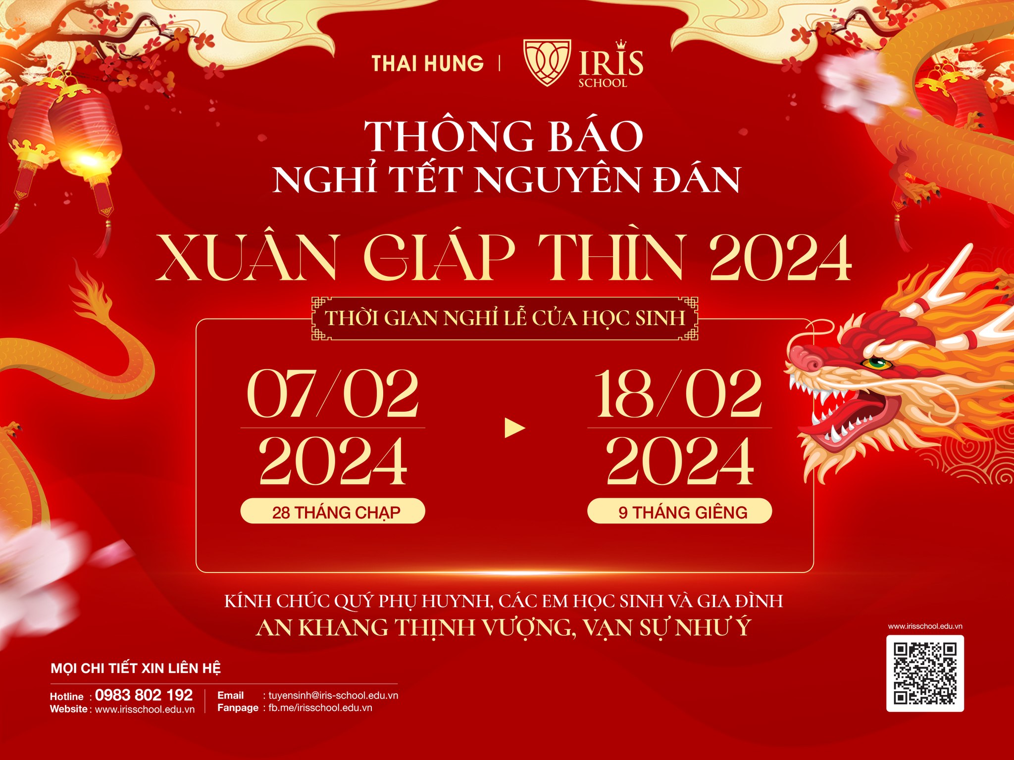 Trường Tiểu học, THCS và THPT Iris xin thông báo tới Quý Phụ huynh và các em học sinh lịch nghỉ Tết Nguyên đán Giáp Thìn 2024 như sau: