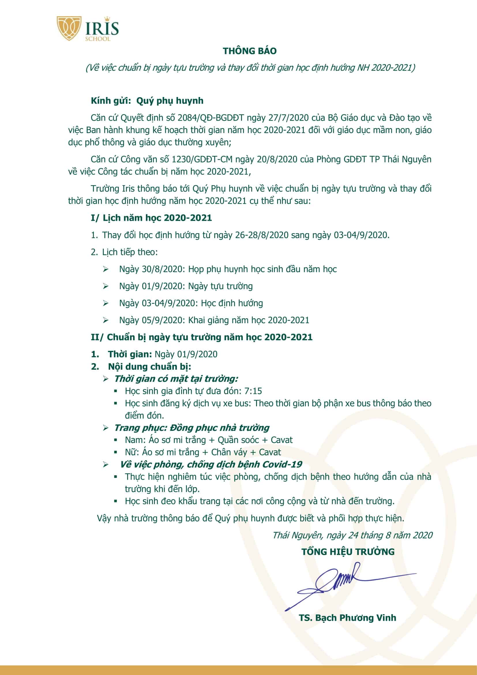 Trường Iris thông báo tới Quý Phụ huynh về việc chuẩn bị ngày tựu trường và thay đổi thời gian học định hướng năm học 2020-2021 cụ thể như sau: