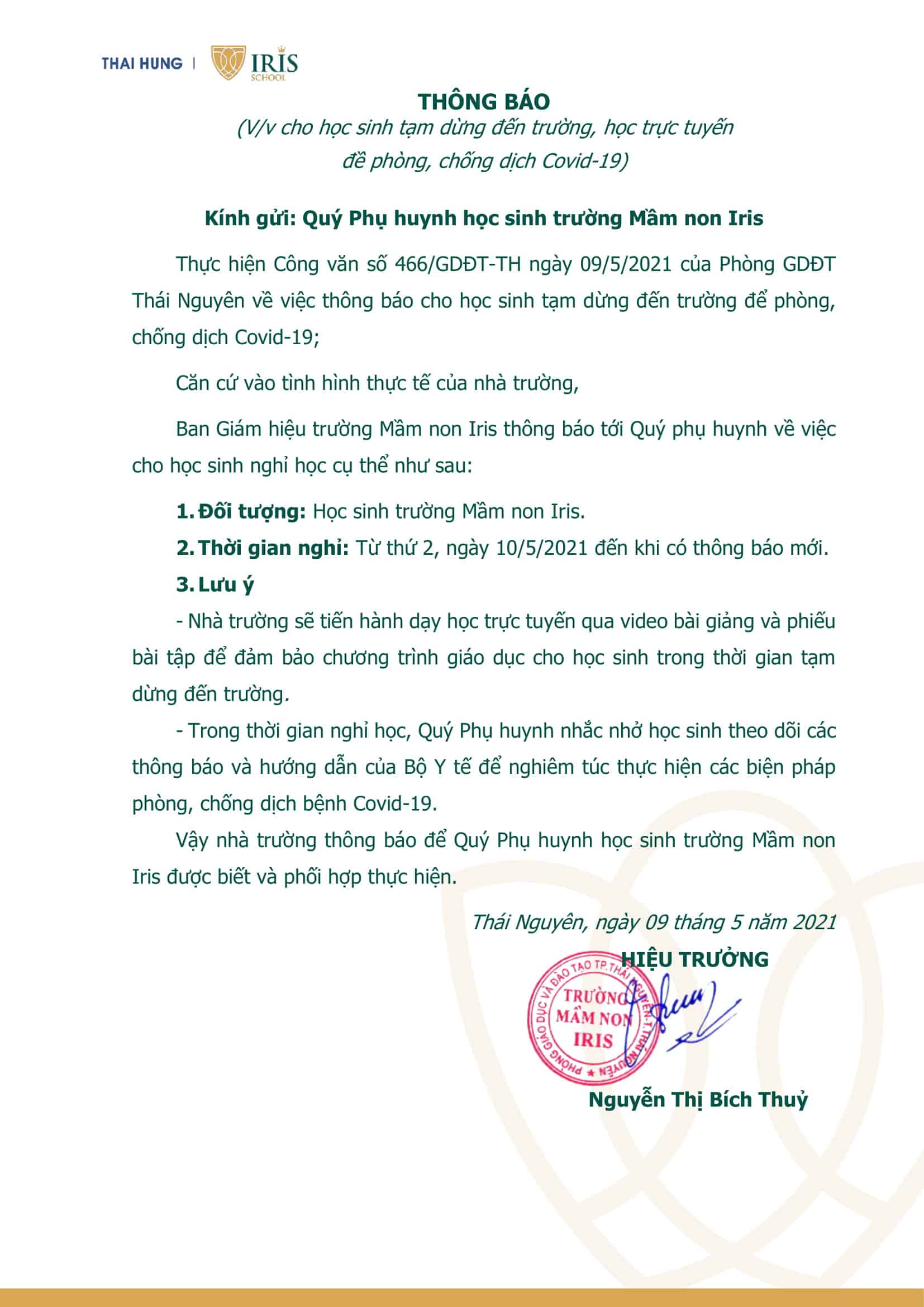 Ban Giám hiệu Trường Mầm non Iris thông báo về việc cho học sinh nghỉ học để phòng, chống dịch bệnh Covid-19 của nhà trường cụ thể như sau: