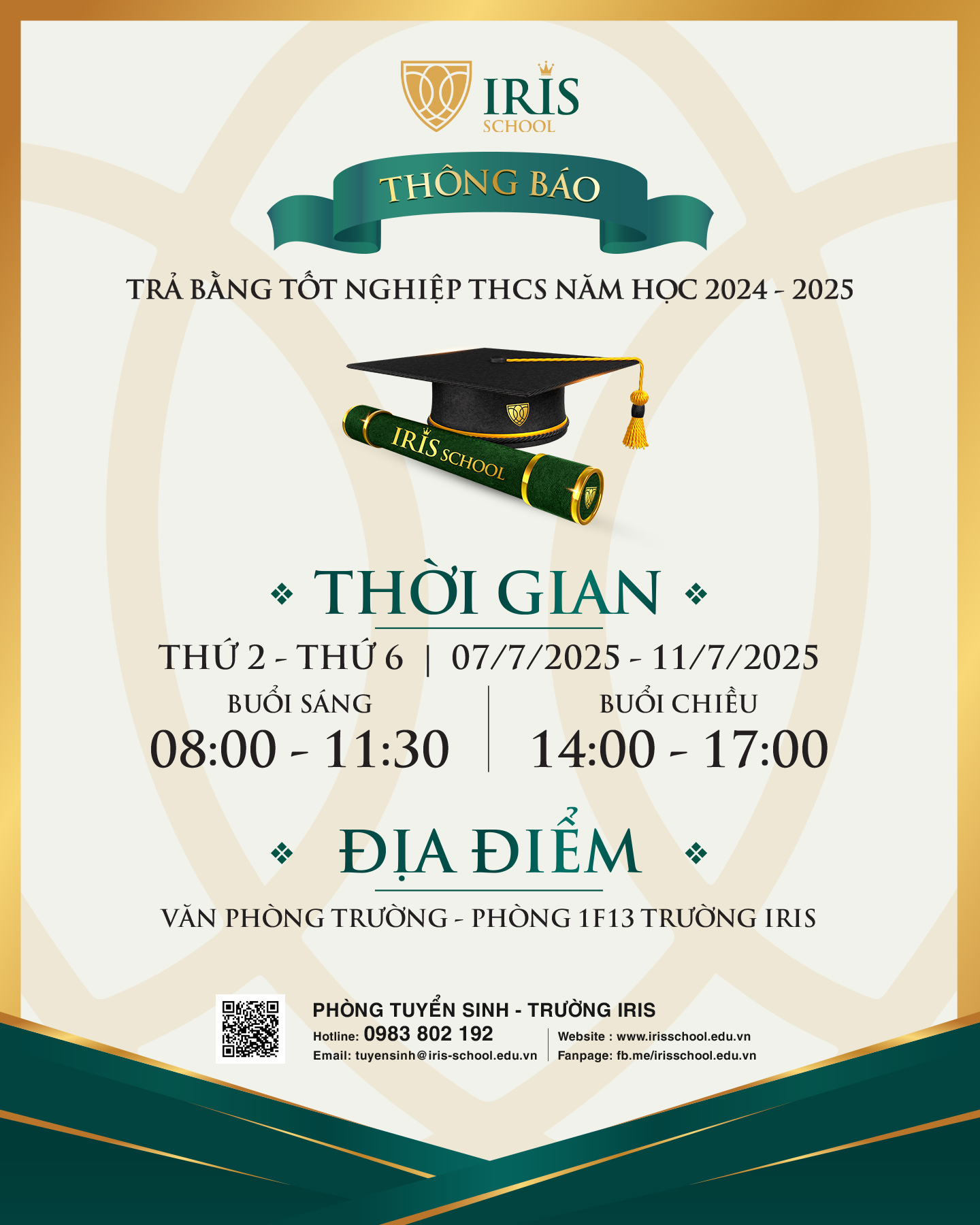 Trường Tiểu học, THCS và THPT Iris thông báo trả bằng tốt nghiệp THCS năm 2025 cho học sinh, thông tin cụ thể như sau: