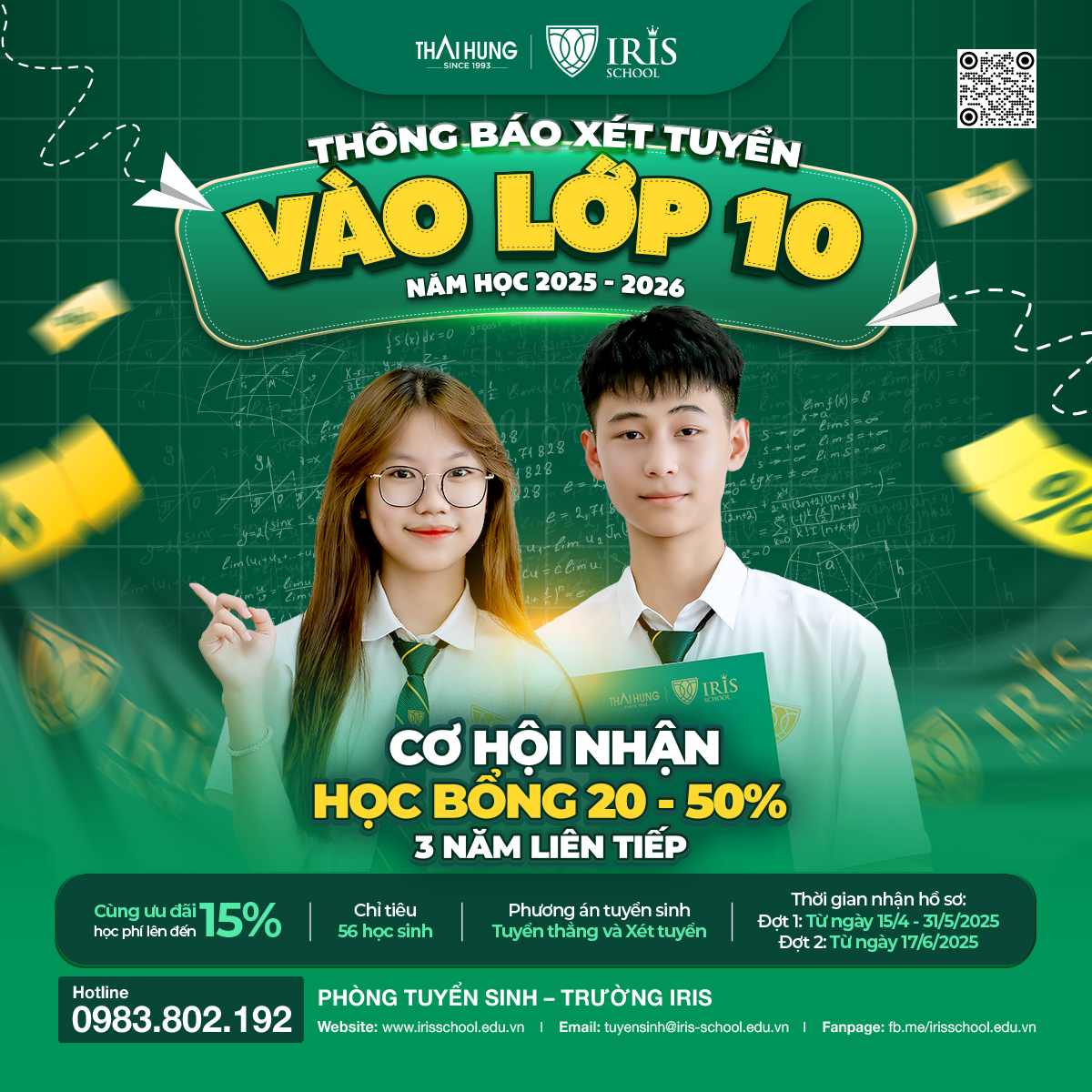 Iris School thông báo chính thức nhận hồ sơ xét tuyển vào lớp 10 năm học 2025 – 2026 như sau: