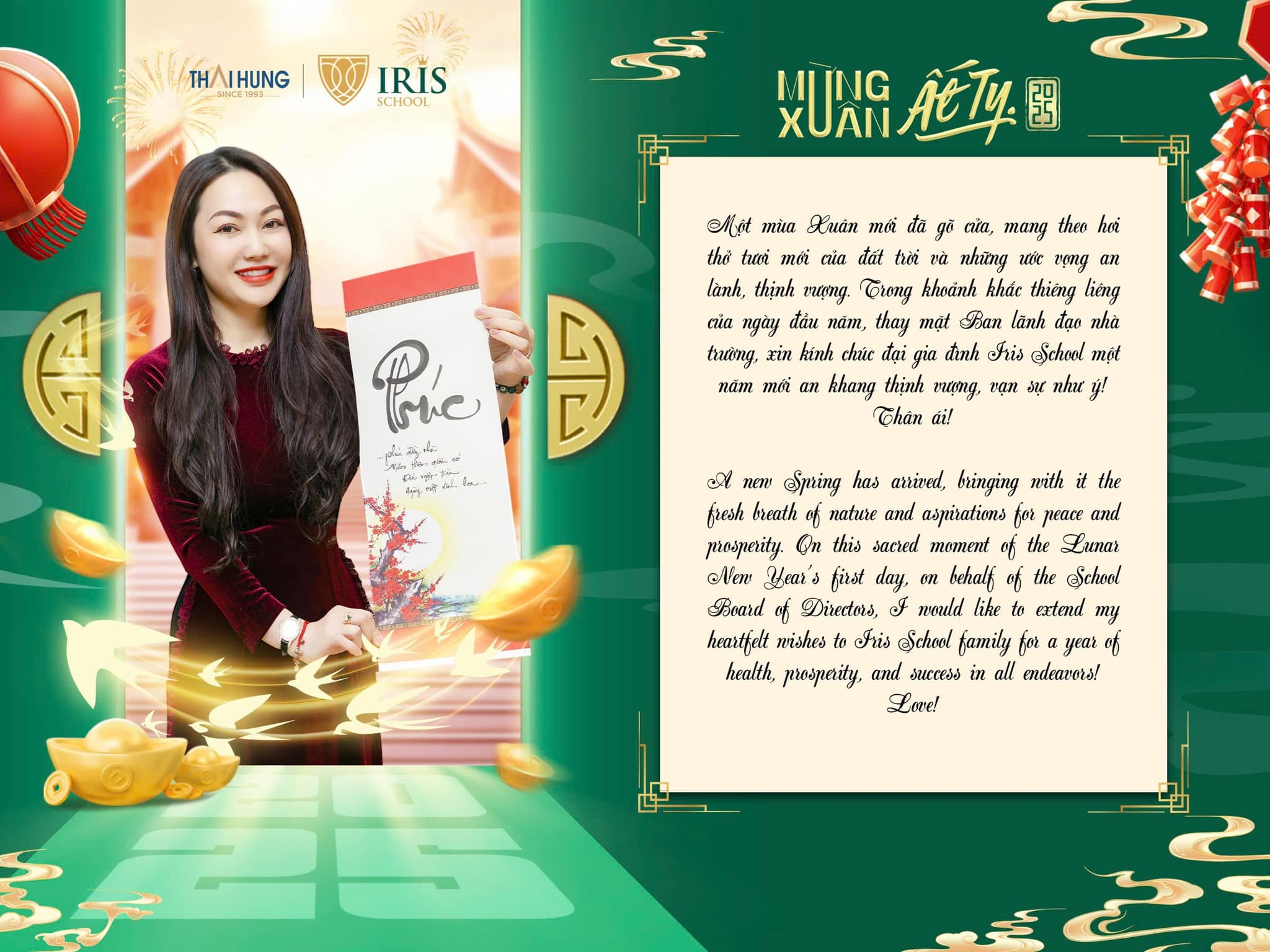Bước sang năm mới Ất Tỵ 2025, tôi tin rằng gia đình Iris School sẽ tiếp tục tỏa sáng, vượt qua mọi thử thách để chinh phục những đỉnh cao mới. Chúng ta hãy cùng nhau đoàn kết, quyết tâm để mỗi ngày trôi qua tại Iris School sẽ không chỉ là một ngày học tập hiệu quả mà còn là một hành trình trải nghiệm cuộc sống và tạo giá trị tới cộng đồng đầy ý nghĩa.