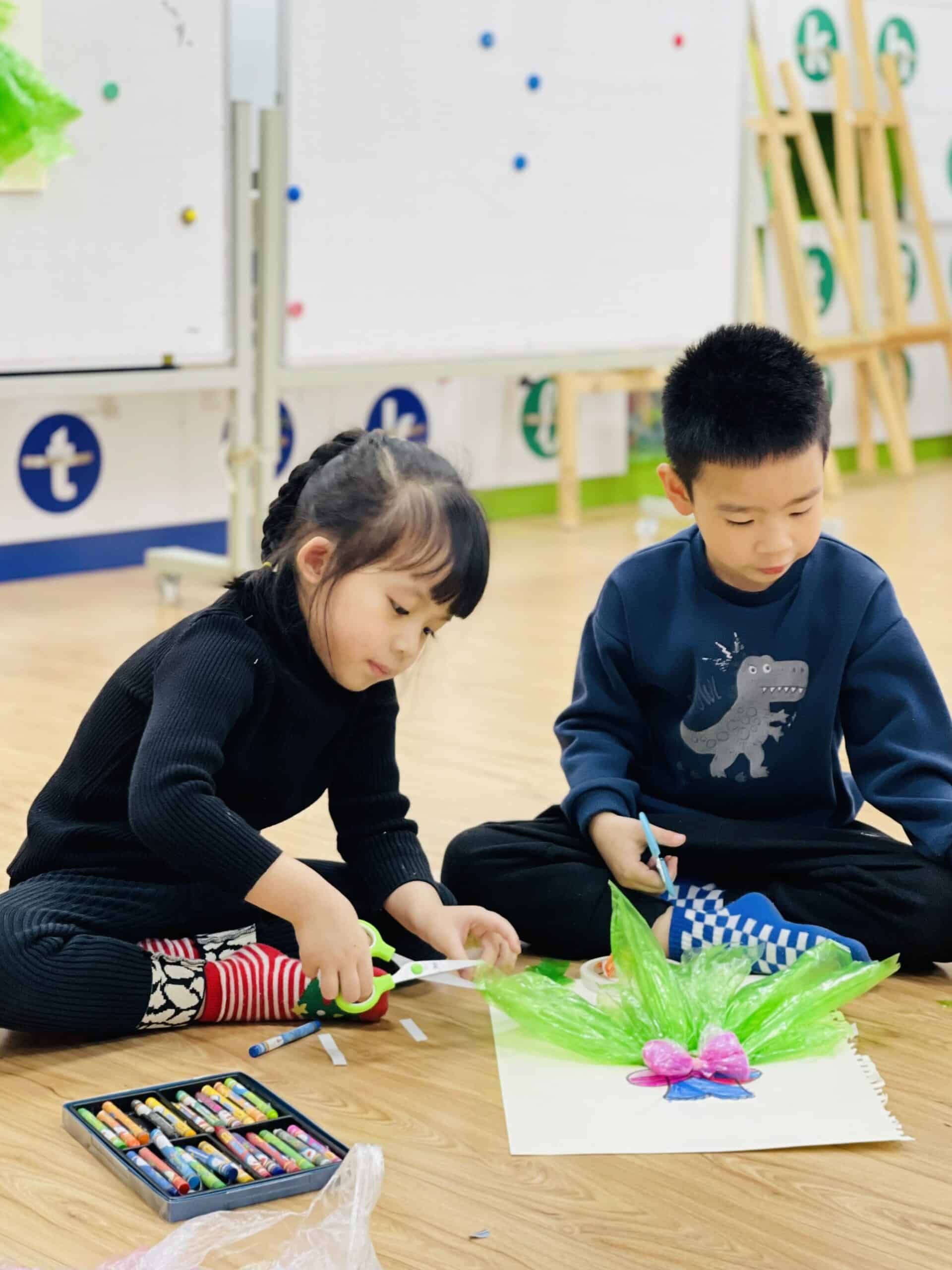 Và trong tuần này, những em bé đáng yêu của lớp Sunny 3 đã được trổ tài thiết kế thời trang và tạo nên những bộ trang phục vô cùng đẹp mắt từ những chiếc bút màu và túi nilon cũ tái chế.