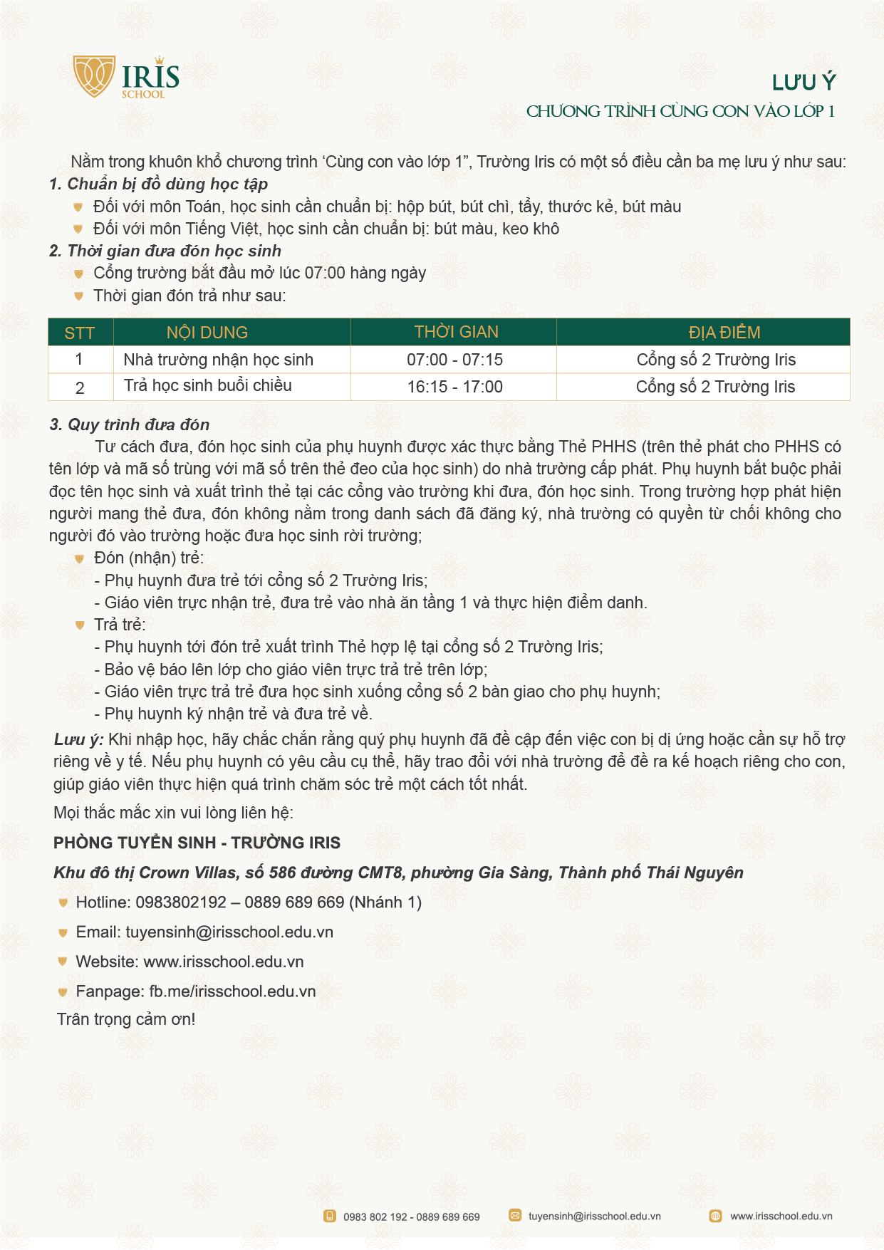 Nằm trong khuôn khổ chương trình ‘Cùng con vào lớp 1”, nhà trường có một số điều cần ba mẹ lưu ý để chuẩn bị cho con khi tham gia trải nghiệm môi trường Tiểu học tại Iris school. Mong ba mẹ theo dõi, thông tin chi tiết như sau: