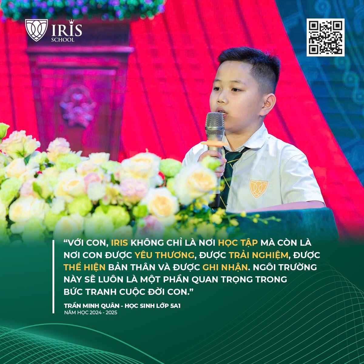 Không chỉ dành tình cảm đặc biệt cho mẹ, người luôn âm thầm đồng hành cùng con trong suốt chặng đường học tập, Minh Quân còn xúc động nhắc đến ngôi trường đã gắn bó suốt những năm tháng tuổi thơ. Quân luôn coi Iris School là một ngôi nhà thứ hai, nơi con lớn lên trong sự yêu thương của thầy cô, sự sẻ chia của bạn bè và những cơ hội được học tập, thể hiện và khẳng định chính mình. “Với con, Iris không chỉ là nơi học tập mà còn là nơi con được yêu thương, được trải nghiệm, được thể hiện bản thân và được ghi nhận. Ngôi trường này sẽ luôn là một phần quan trọng trong bức tranh cuộc đời con.”