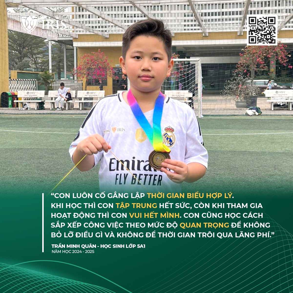 “Con luôn cố gắng lập thời gian biểu hợp lý. Khi học thì con tập trung hết sức, còn khi tham gia hoạt động thì con vui hết mình. Con cũng học cách sắp xếp công việc theo mức độ quan trọng để không bỏ lỡ điều gì và không để thời gian trôi qua lãng phí.” Chính sự chủ động ấy đã giúp Minh Quân giữ được trạng thái cân bằng giữa học tập và trải nghiệm, một yếu tố quan trọng góp phần vào sự trưởng thành vững vàng của con hôm nay.