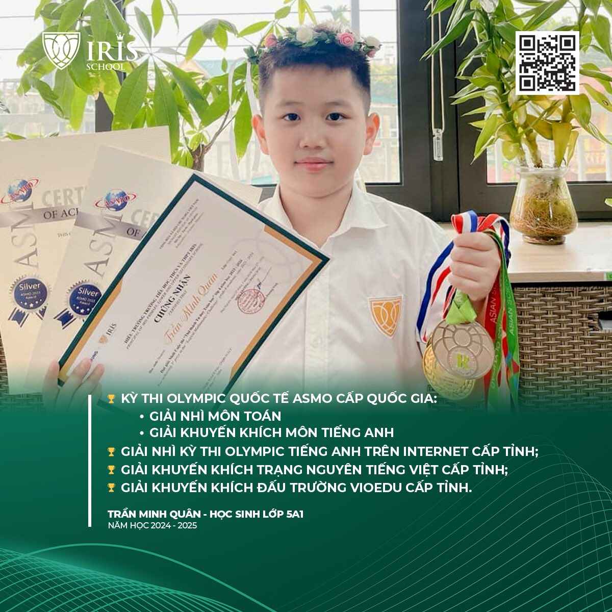 Là học sinh có thành tích học tập nổi bật qua nhiều năm, Minh Quân luôn duy trì tinh thần tự học, sự chỉn chu trong kế hoạch rèn luyện và niềm say mê với tri thức. Con tâm sự: “Ở Iris School, con được thầy cô hướng dẫn cách tự học, tư duy logic và được tạo động lực để yêu thích môn Toán. Nhờ vậy, con tự tin hơn rất nhiều khi bước vào kỳ thi.”
