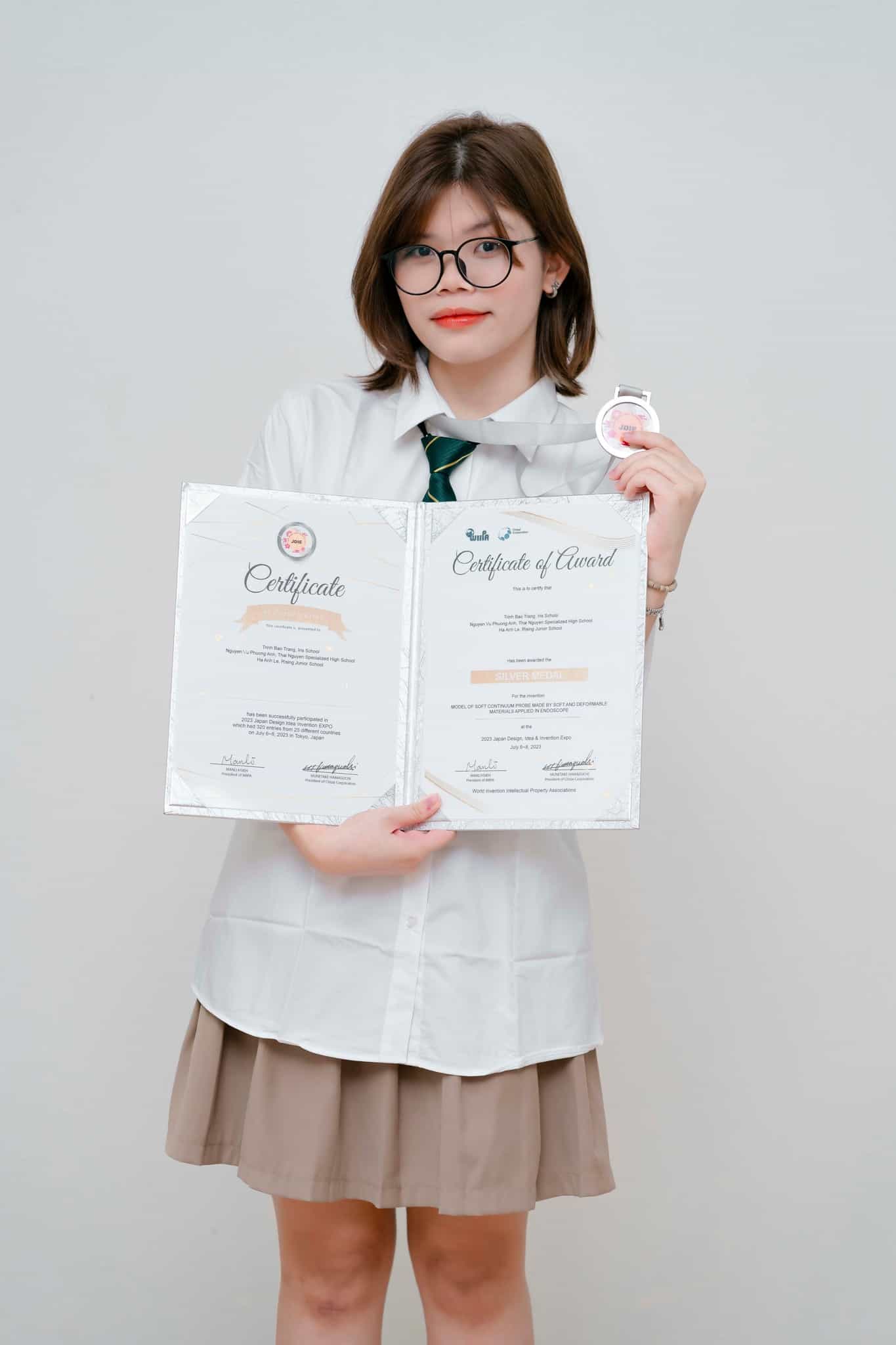 Bảo Trang tích cực tìm tòi, lên ý tưởng và thực hiện các dự án khoa học tham gia Cuộc thi Khoa học kỹ thuật cấp trường hằng năm và đều nhận được đánh giá cao từ Ban Giám khảo. Đặc biệt, trong tháng 7 vừa qua, sáng chế “Mô hình đầu dò linh hoạt từ vật liệu mềm hỗ trợ quá trình mổ nội soi” của Bảo Trang và bạn đồng hành đã xuất sắc vượt qua gần 320 đội thi lứa tuổi học sinh – sinh viên đến từ hơn 25 quốc gia trên toàn thế giới để giành giải Bạc tại cuộc thi Japan Design, Idea and Invention Expo 2023 (Triển lãm Thiết kế và Phát minh Nhật Bản 2023) được tổ chức tại Tokyo.