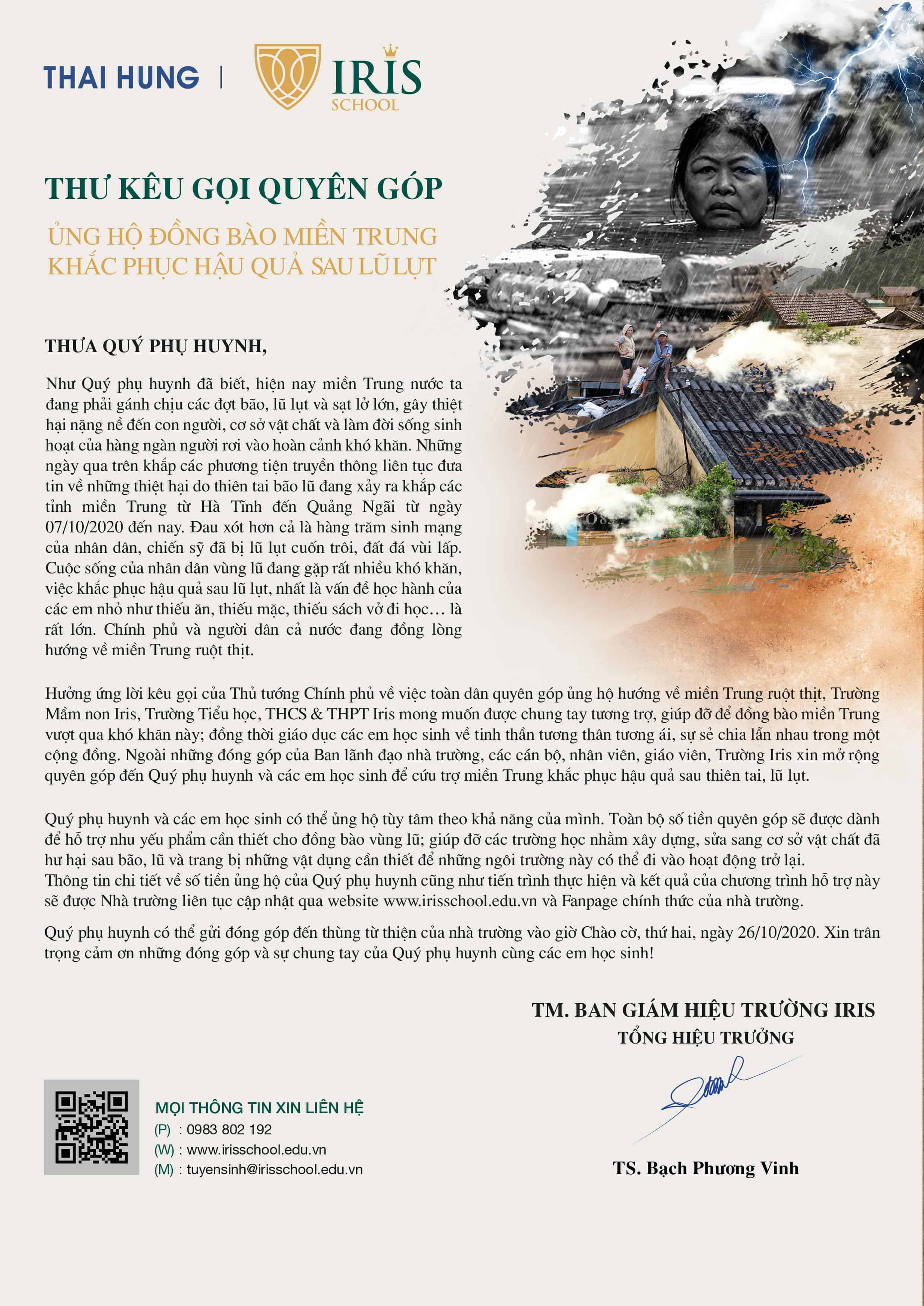 Hưởng ứng lời kêu gọi của Thủ tướng Chính phủ về việc toàn dân quyên góp ủng hộ hướng về miền Trung ruột thịt, Trường Mầm non Iris, Trường Tiểu học, THCS & THPT Iris mong muốn được chung tay tương trợ, giúp đỡ để đồng bào miền Trung vượt qua khó khăn này; đồng thời giáo dục các em học sinh về tinh thần tương thân tương ái, sự sẻ chia lẫn nhau trong một cộng đồng. Ngoài những đóng góp của Ban lãnh đạo nhà trường, các cán bộ, nhân viên, giáo viên, Trường Iris xin mở rộng quyên góp đến Quý phụ huynh và các em học sinh để cứu trợ miền Trung khắc phục hậu quả sau thiên tai, lũ lụt.