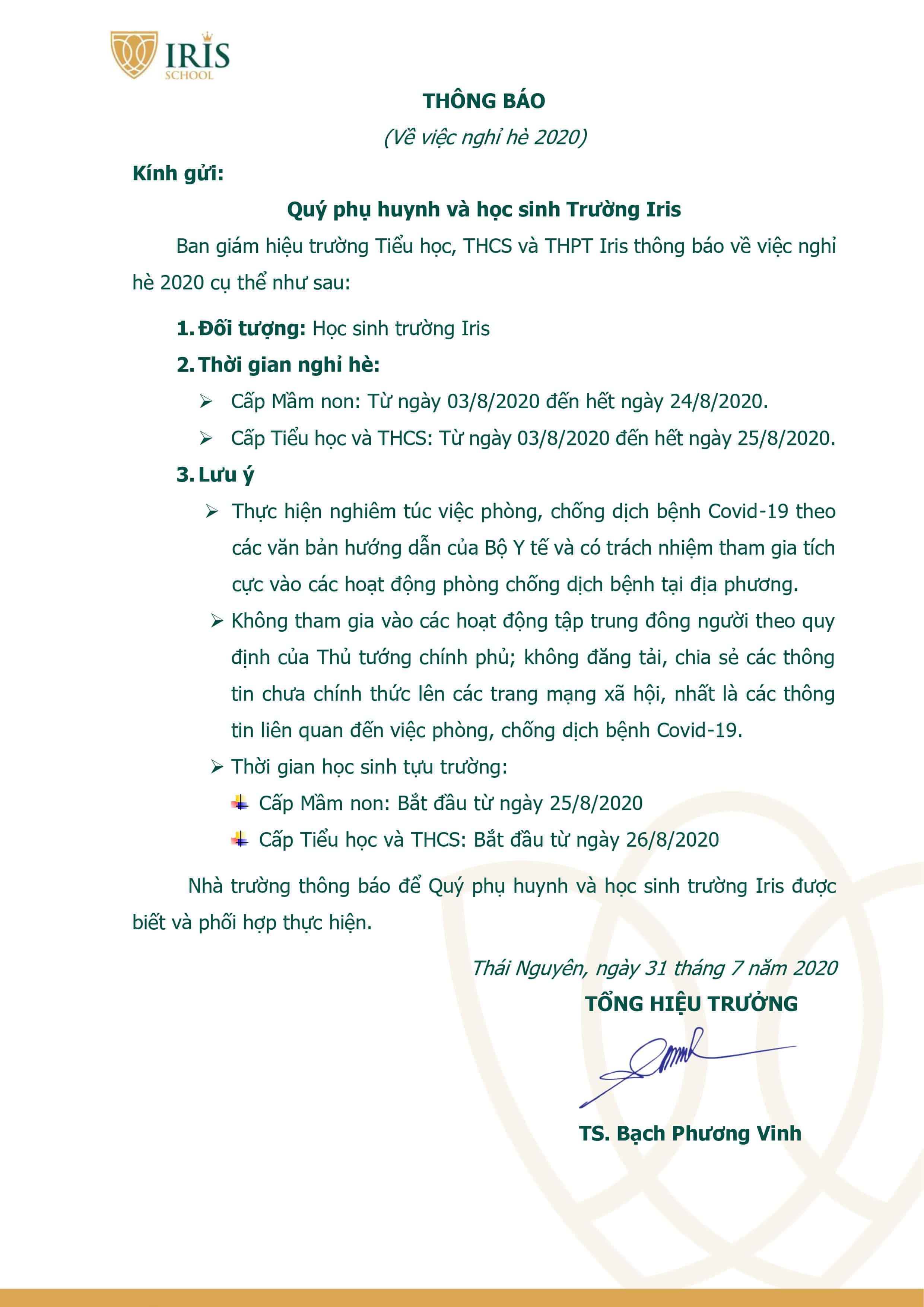 Thông báoTrường Iris: Thông báo nghỉ hè Đăng vào Tháng 7 30, 2020Tháng 8 1, 2020 bởi Trường Iris Thông báo về việc vận hành Hệ Pearson Edexcel năm học 2020 – 2021 Thông báo rời ngày thi chung kết cuộc tranh tài “Nhà Toán học tương lai”